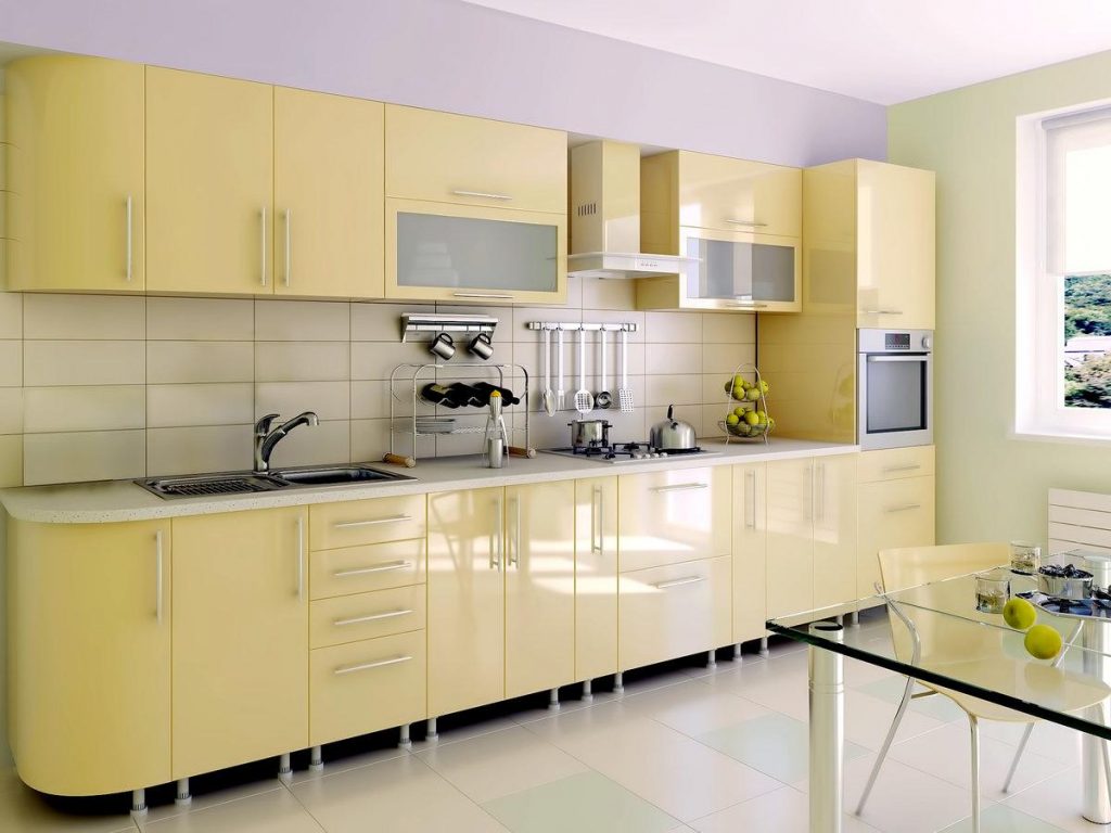 Солнечная, жёлтая кухня прекрасно сочетается со светло-зелёным акцентом, сиреневым, а также красным. А как фон – идеален белый. Впрочем, он идеален всегда.