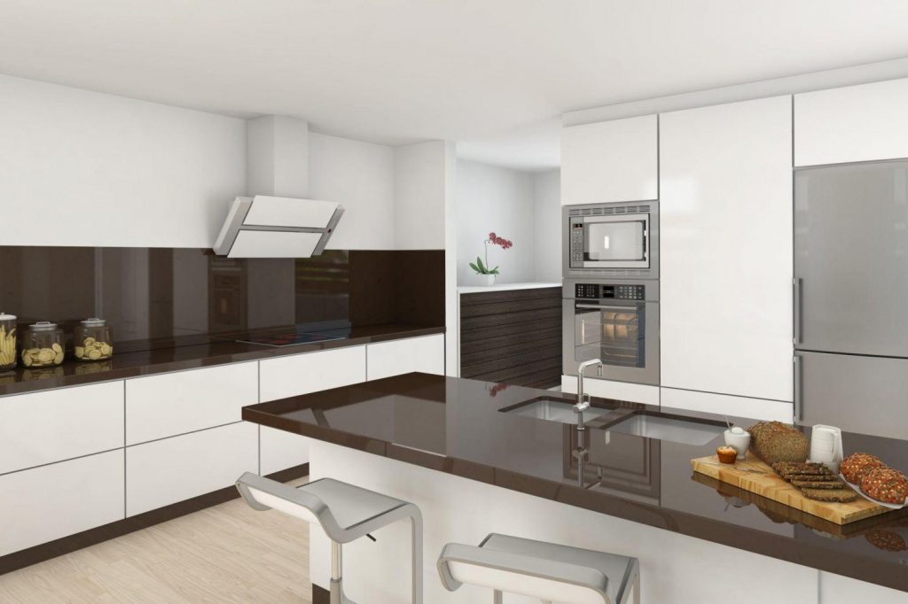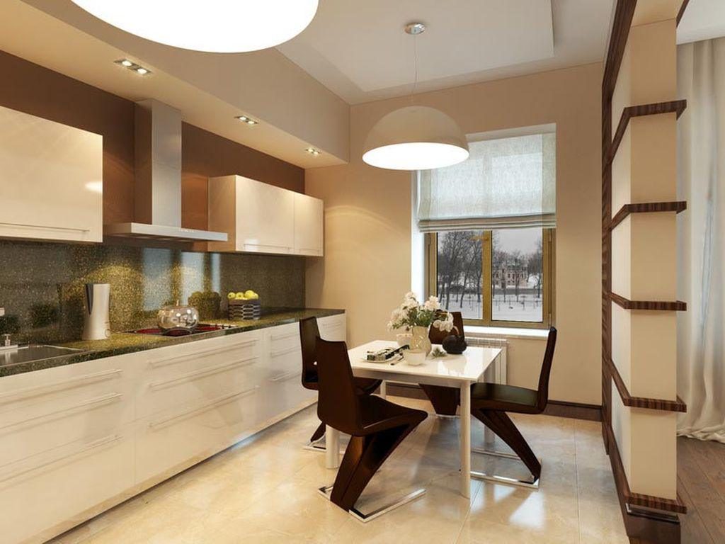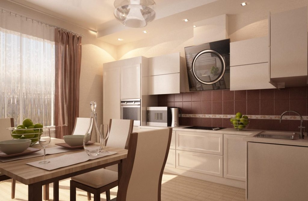 - Очень оригинальный вид имеет белая кухня с коричневыми стенами. Конечно же, тональность можно подобрать более светлую, например, цвет капучино или какао. В таком случае, свой выбор лучше остановить на белом кухонном гарнитуре в сочетании с напольным покрытием светлых оттенков. Помните, что светлых оттенков в небольшом помещении должно быть больше, нежели темных.
