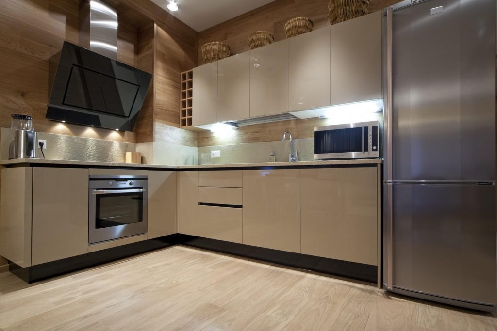 - Функциональная бытовая техника, гармонирующая с гарнитуром. Вы спросите, при чем тут техника? Электроприборы на кухне играют большую роль, и если вы решили сделать низ темным, то и духовой шкаф следует подбирать под цвет, а не использовать хромированный оттенок. Что касается холодильника, то его лучше всего сделать встроенным, так существует возможность на нем гармонично скомбинировать противоположные оттенки.