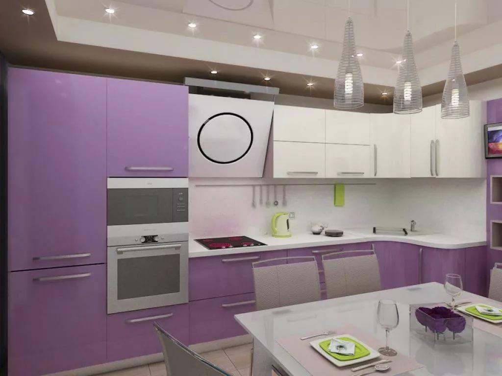 В современном интерьере хорошо смотрится комбинация белого и фиолетового цветов, на кухонный фартук можно добавить голубой оттенок