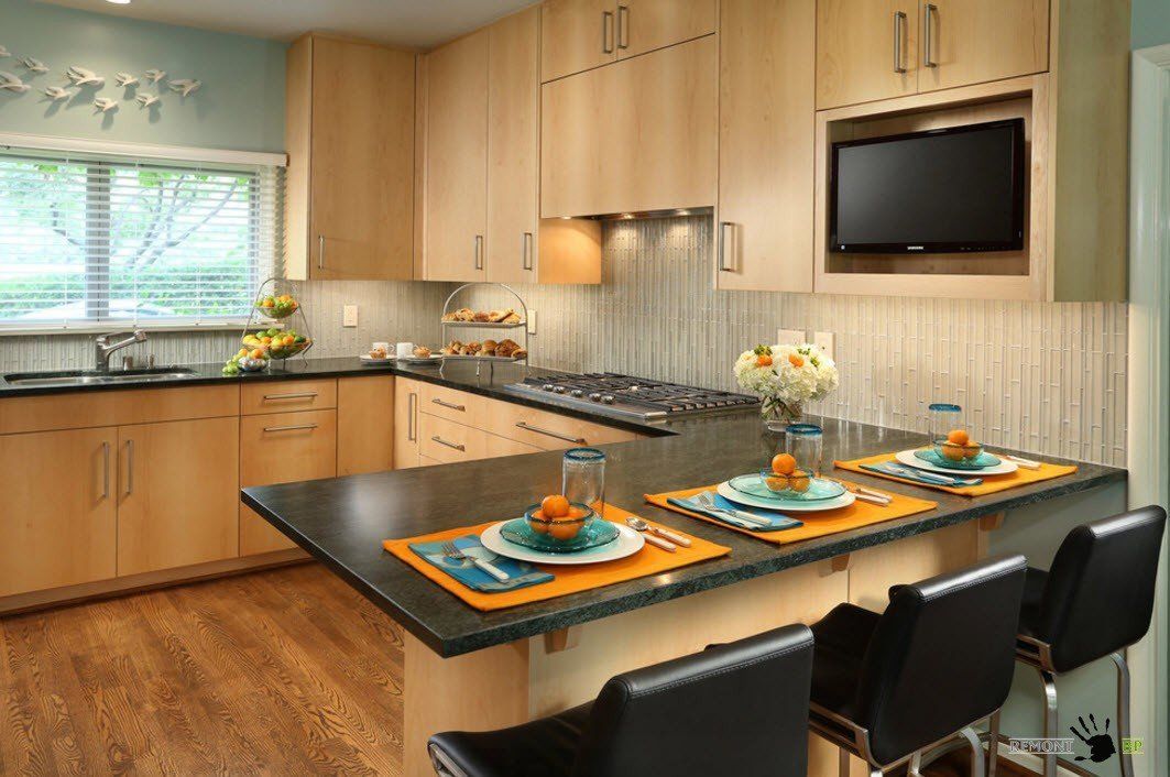 Только обратите внимание на ее высоту, чтобы дети и пожилые люди не чувствовали дискомфорта, взбираясь на слишком высокие стулья. Для рабочей зоны остается достаточно много места, чтобы хозяйка чувствовала себя комфортно.. Варианты размещения мебели и техники