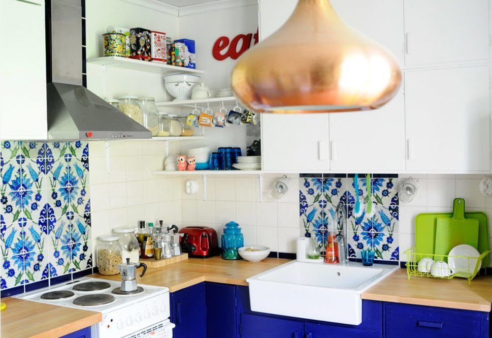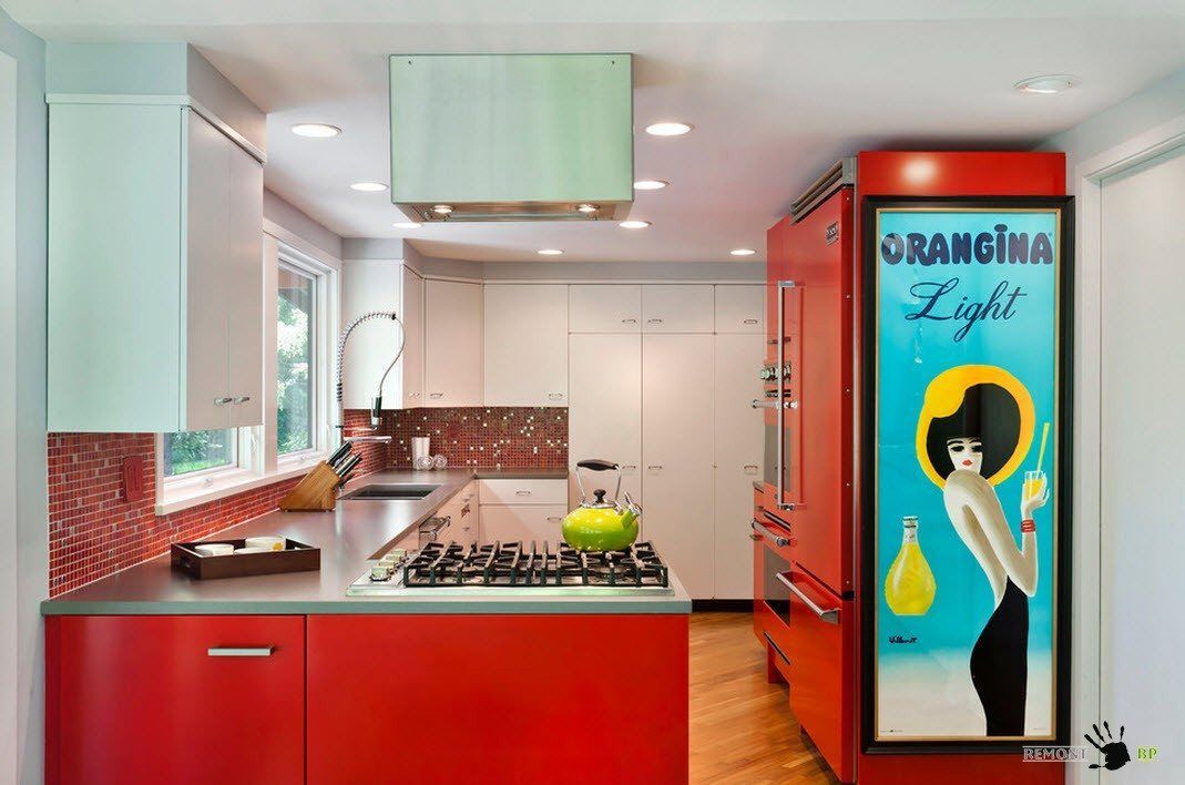 Маленькая кухня – не повод поставить крест на использовании ярких цветов и контрастных сочетаний. Просто нужно знать меру в использовании колоритных оттенков и темных цветов. Если вы планируете установку яркого гарнитура (или его частей), то отделка маленькой комнаты должна быть светлой (лучше белой). И наоборот – при использовании яркой отделки стен, выделении акцентной поверхности с помощью пестрых принтов, лучше использовать однотонные светлые варианты фасадов кухонных шкафов.