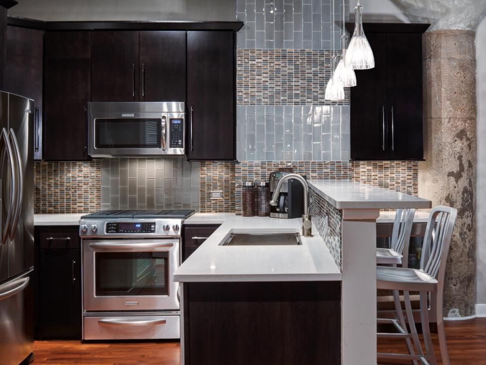 Барная стойка — отличный способ экономии места на маленькой кухне. Ее можно использовать вместо обеденного стола, расположив рядом несколько высоких барных стульев.