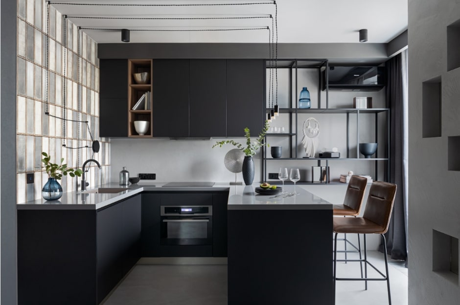 П-образная планировка – отличное решение для большой или средней по площади кухни. Для кухни-гостиной или студии это отличный вариант зонирования
