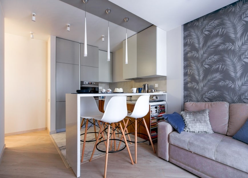 Здесь можно организовать барную стойку, которая в маленькой квартире будет служить самостоятельной обеденной зоной.