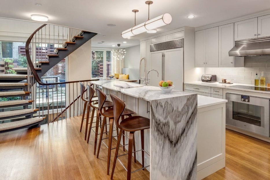 В многоквартирных домах островное расположение мебели возможно в случае, если кухня объединена с гостиной, или же квартира изначально имела свободную планировку. При этом не всегда будет возможно подвести коммуникации, так как двигать мокрую зону по закону можно только вдоль одной стены. Идеи с сооружением подиума, под которым будут спрятаны коммуникации, хлопотны и часто предполагают нарушение законодательства. Самый оптимальный вариант в данном случае – сделать остров дополнительным модулем для хранения и рабочей поверхностью.