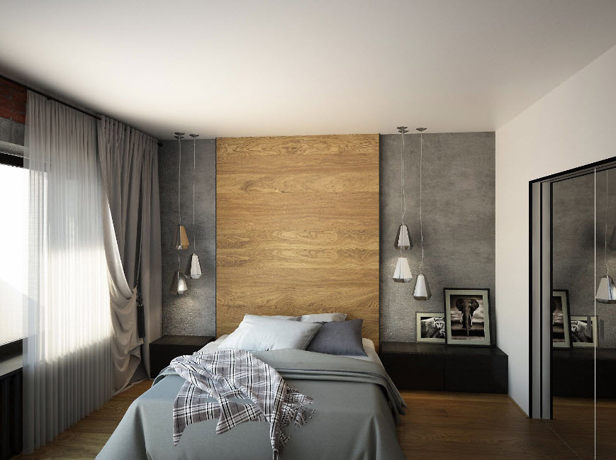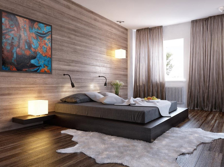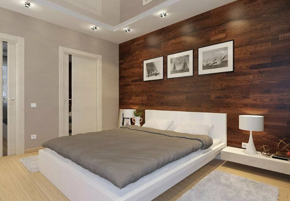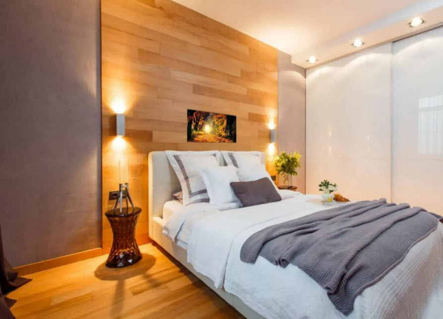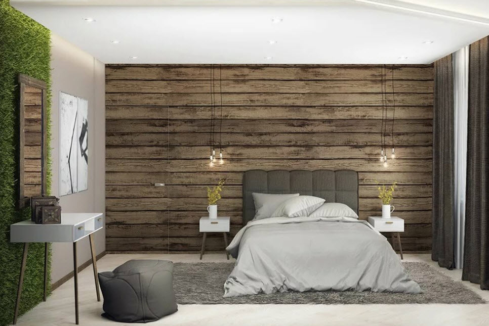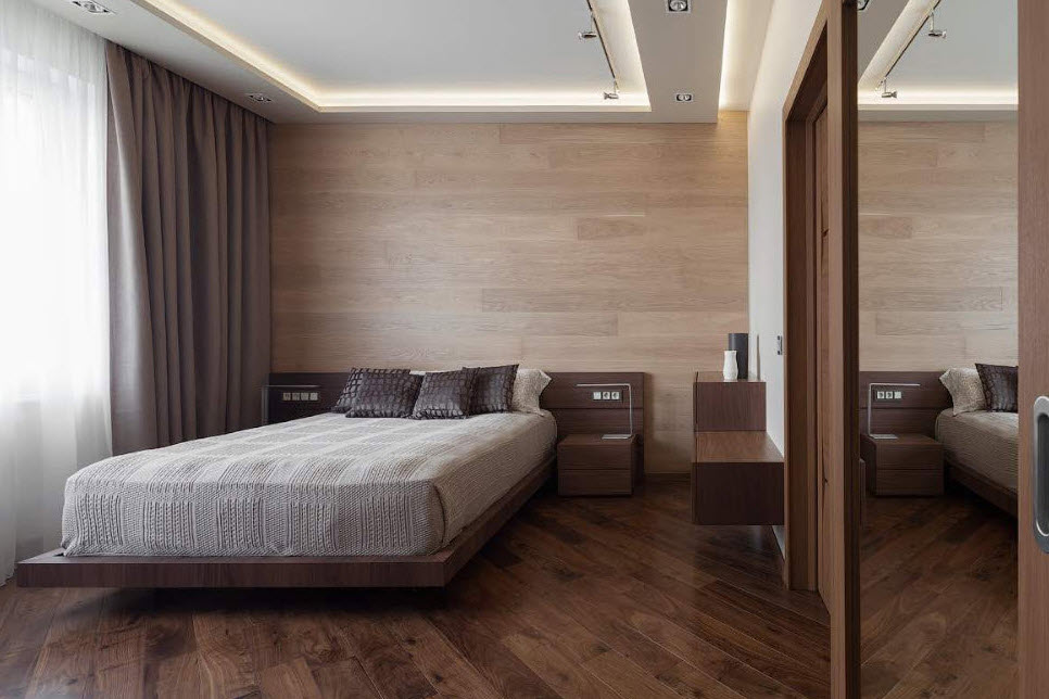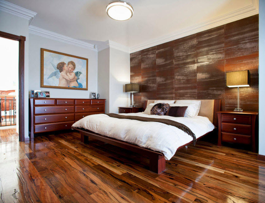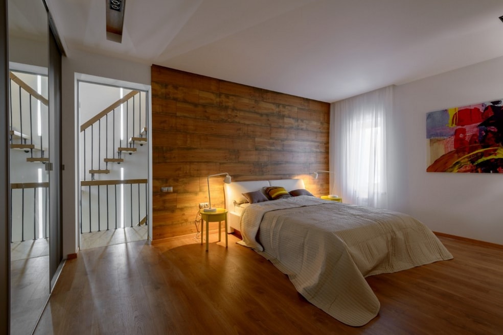Спальня. Ламинат, переходящий от пола на стену смотрится привлекательно, подчеркивает изысканный вкус домовладельца. Что касается цветовой палитры, то можно выбрать поверхности одного оттенка или же контрастирующие материалы.