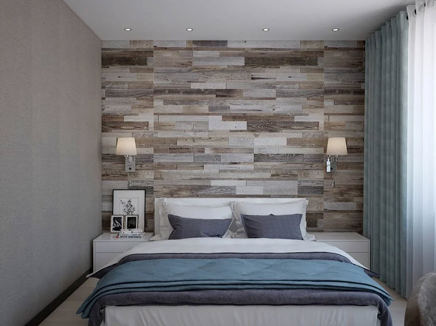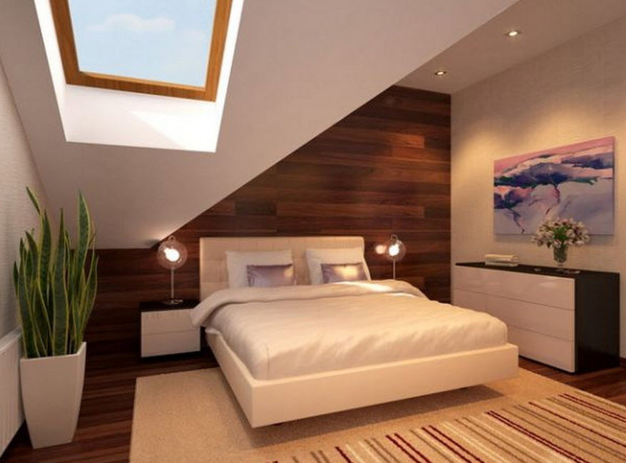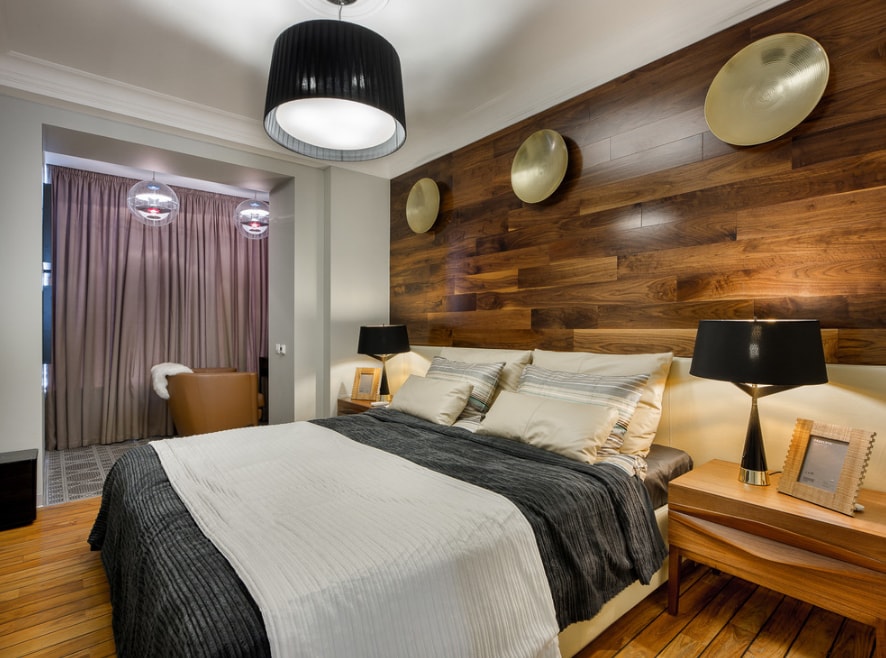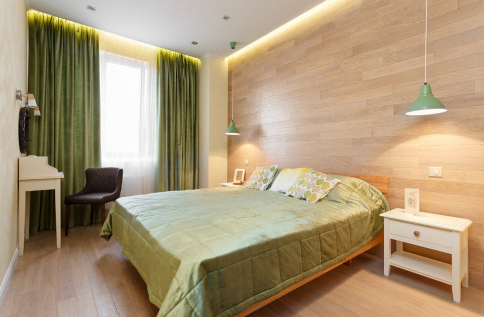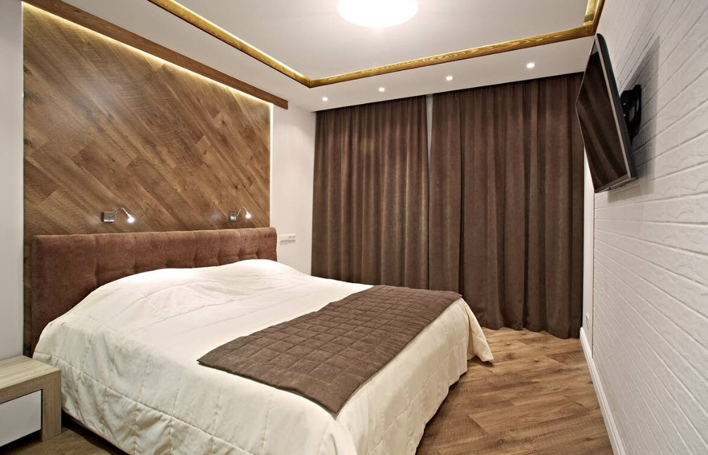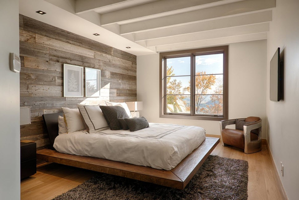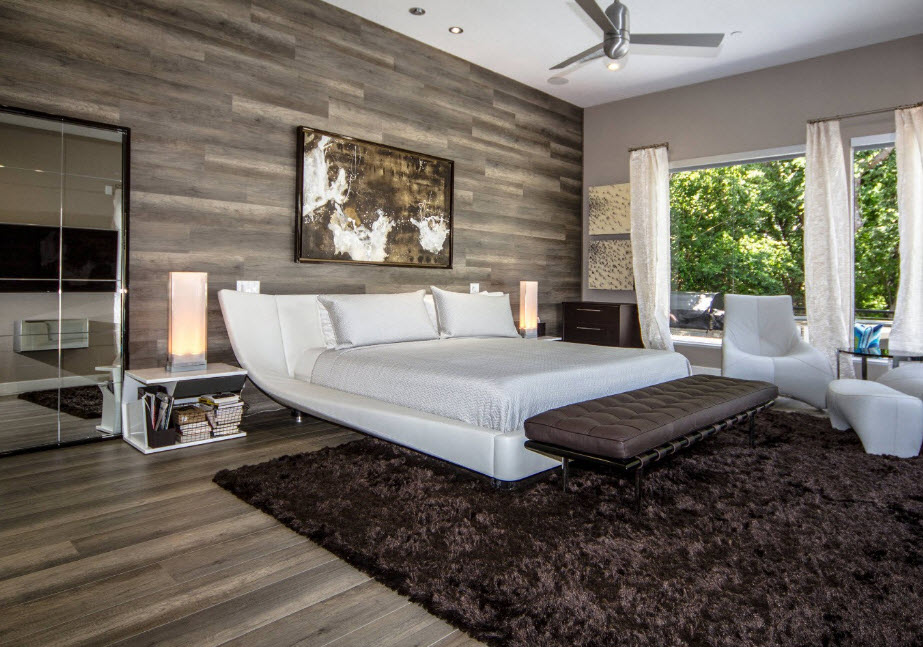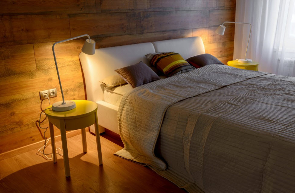 Спальня. Ламинат, переходящий от пола на стену смотрится привлекательно, подчеркивает изысканный вкус домовладельца. Что касается цветовой палитры, то можно выбрать поверхности одного оттенка или же контрастирующие материалы.