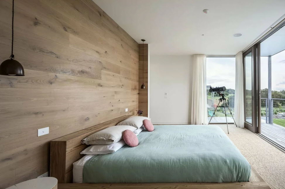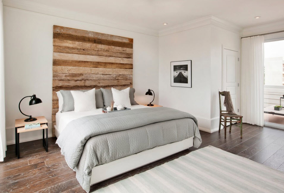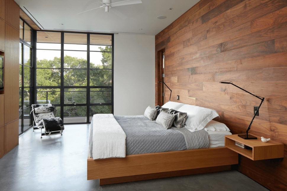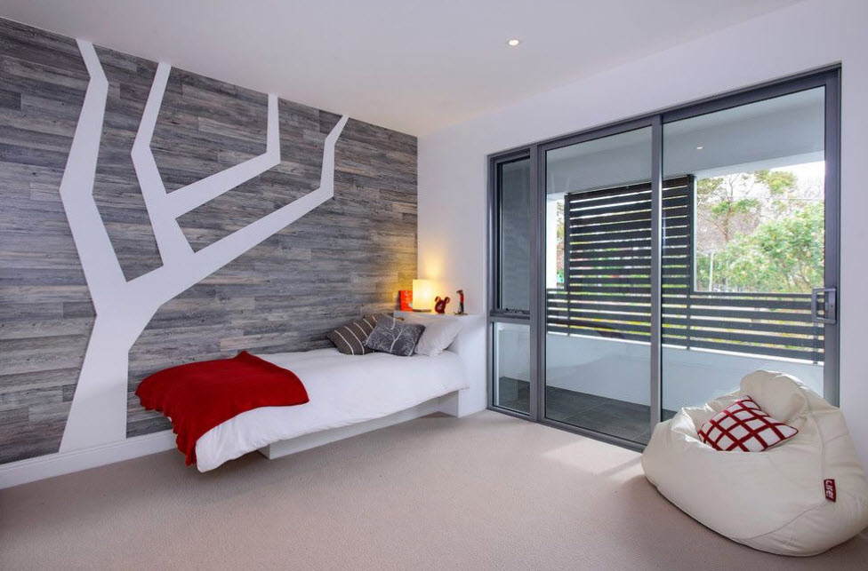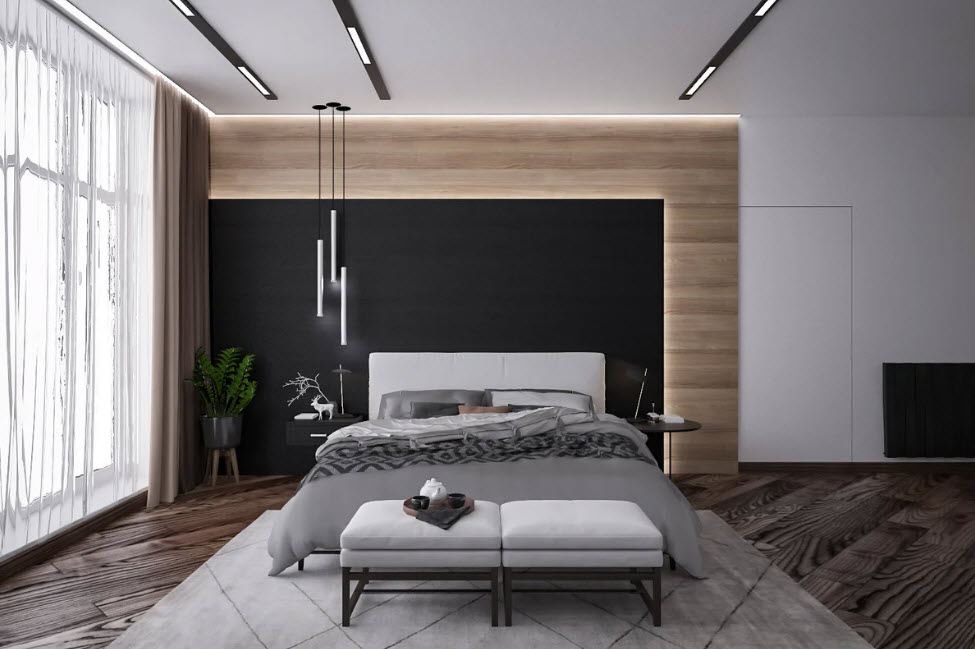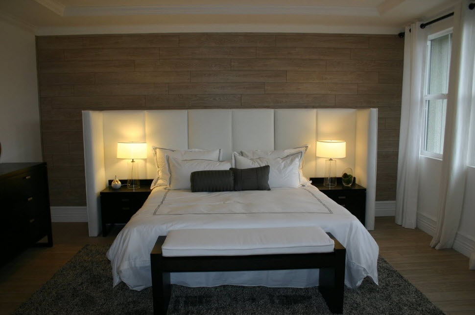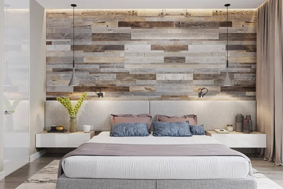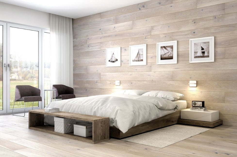Спальня. Ламинат, переходящий от пола на стену смотрится привлекательно, подчеркивает изысканный вкус домовладельца. Что касается цветовой палитры, то можно выбрать поверхности одного оттенка или же контрастирующие материалы.