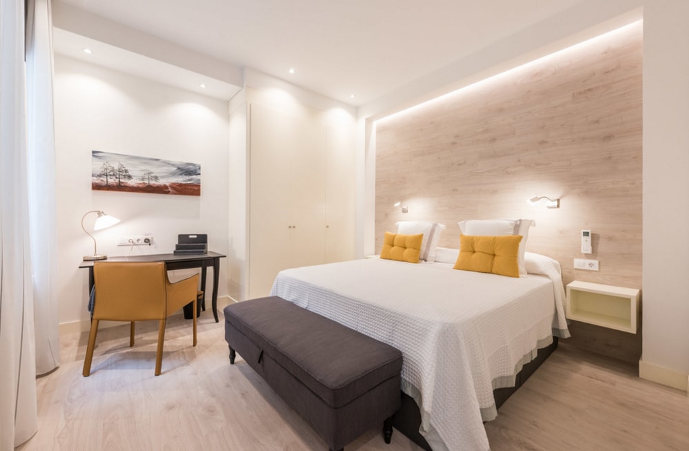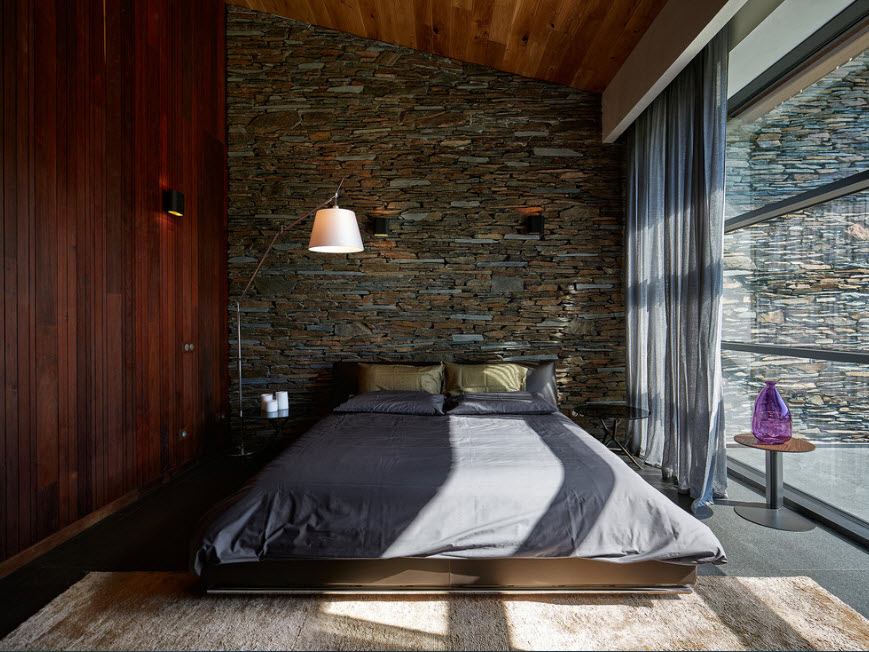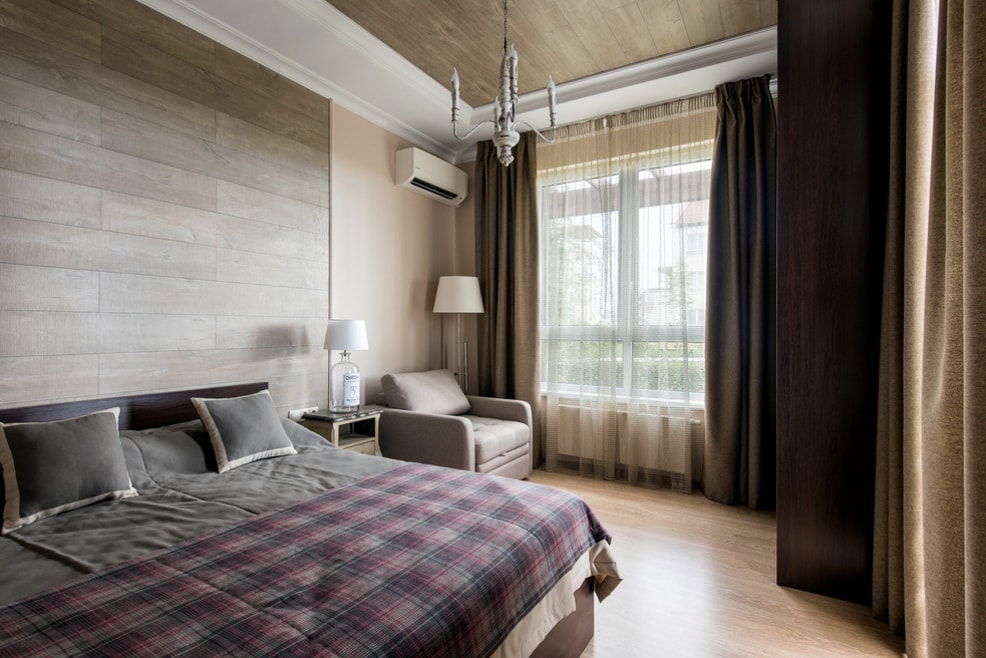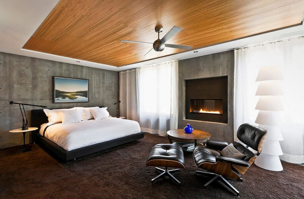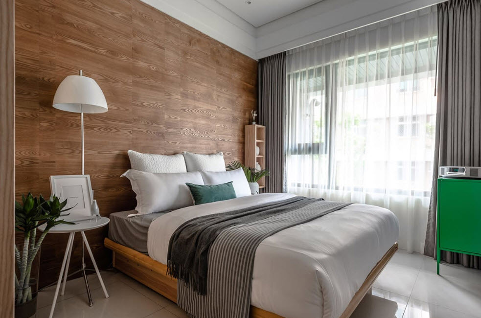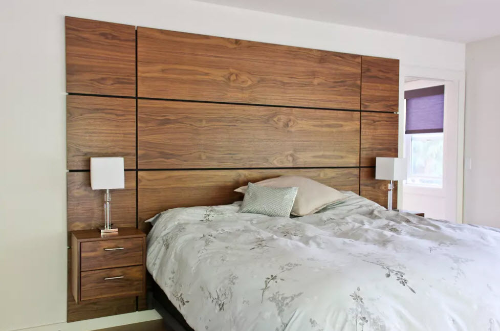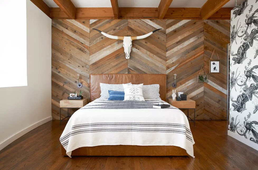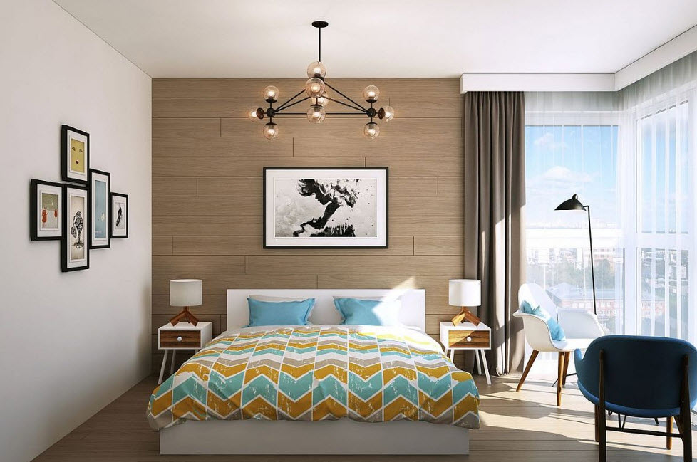 Спальня. Ламинат, переходящий от пола на стену смотрится привлекательно, подчеркивает изысканный вкус домовладельца. Что касается цветовой палитры, то можно выбрать поверхности одного оттенка или же контрастирующие материалы.