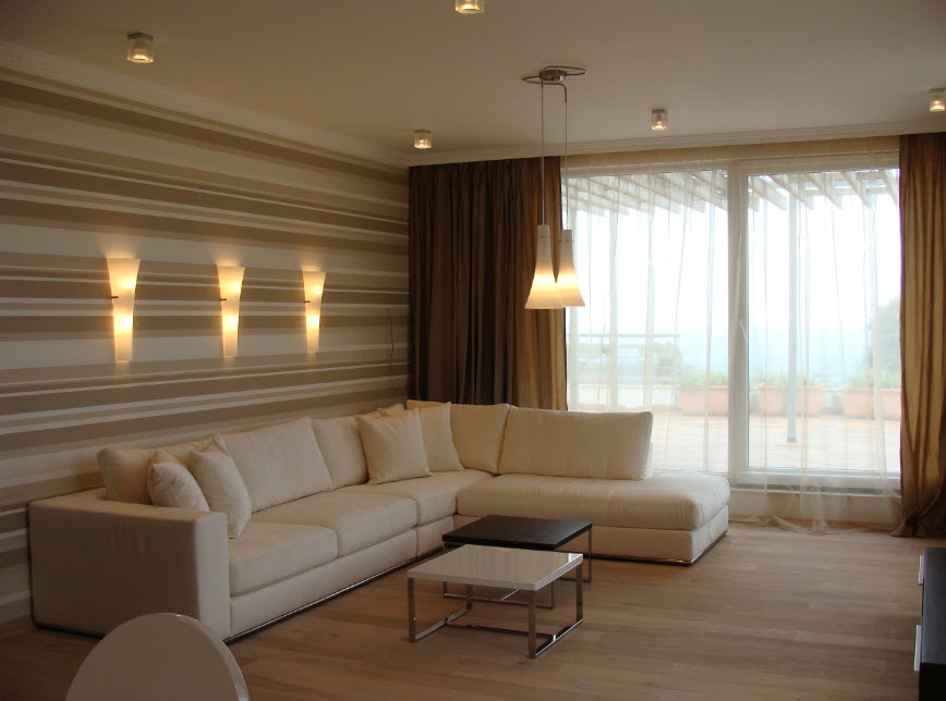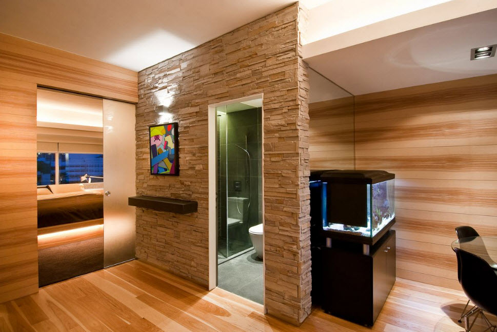 - Следует хорошо продумать, как не перегрузить интерьер. Можно использовать варианты сочетания с другими видами настенных или напольных покрытий, например, паркетной доски на полу, частичного покрытия (например, на треть стены), что сохранит баланс в оформлении.