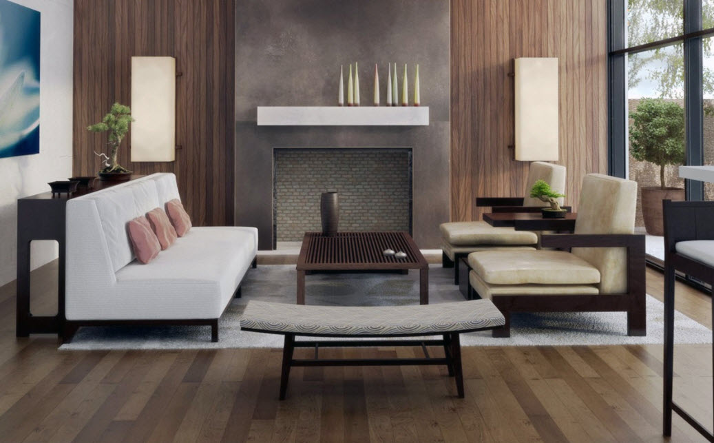 - Японский стиль отличают приглушенные акценты, которые помогают подчеркнуть минимализм общего дизайна интерьера, элегантность и сдержанность. Должно быть не более трех оттенков. Предпочтительным цветом является серый.