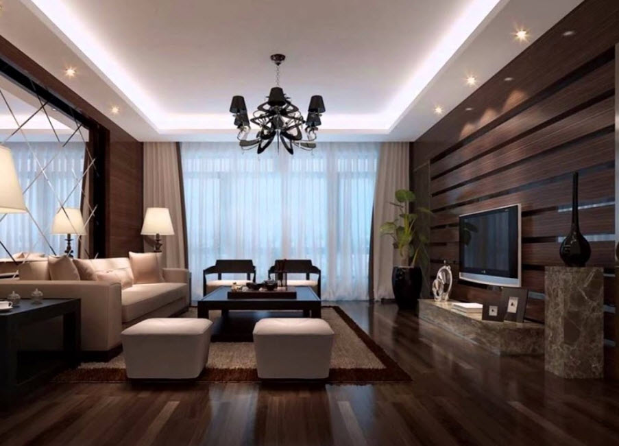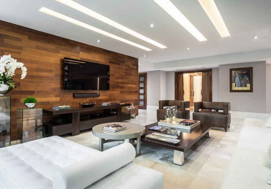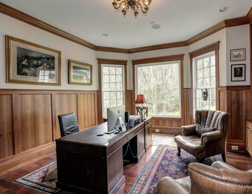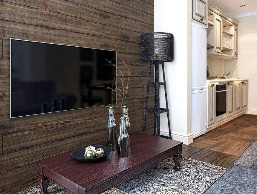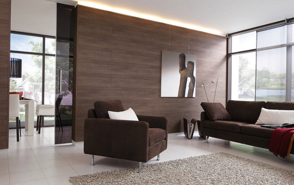 - Элегантно выглядит сочетание темных панелей и светлого однотонного основного фона стен.