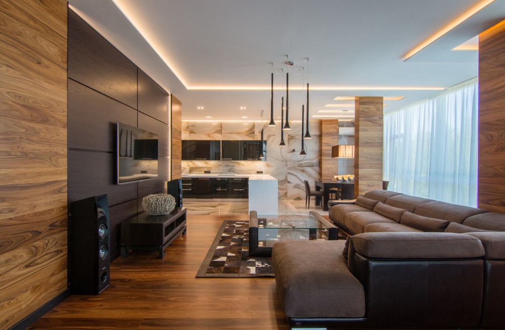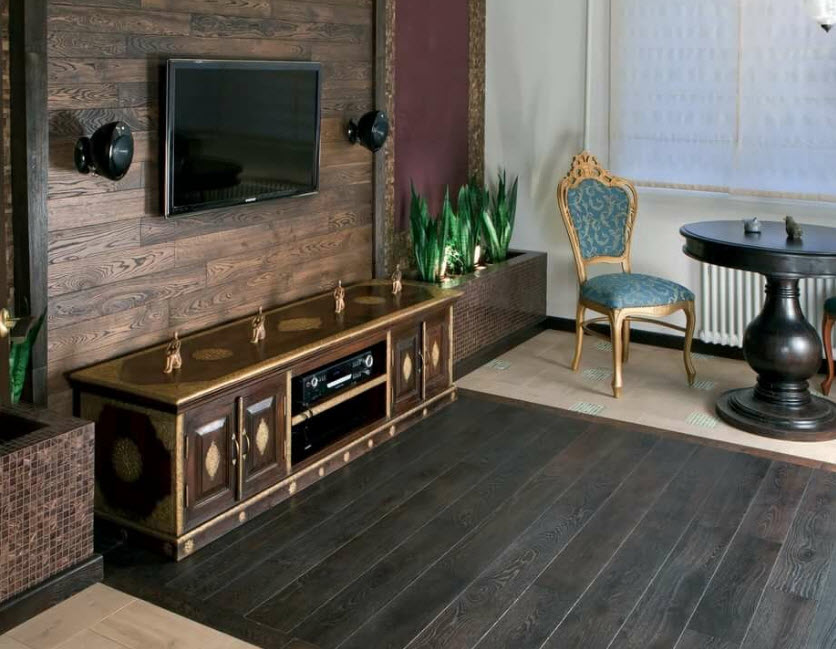 Возможность визуально заполнить пустоту. Если большая комната выглядит пустоватой, а какие-либо добавления противоречат стилю, темный ламинат – лучшее решение.
