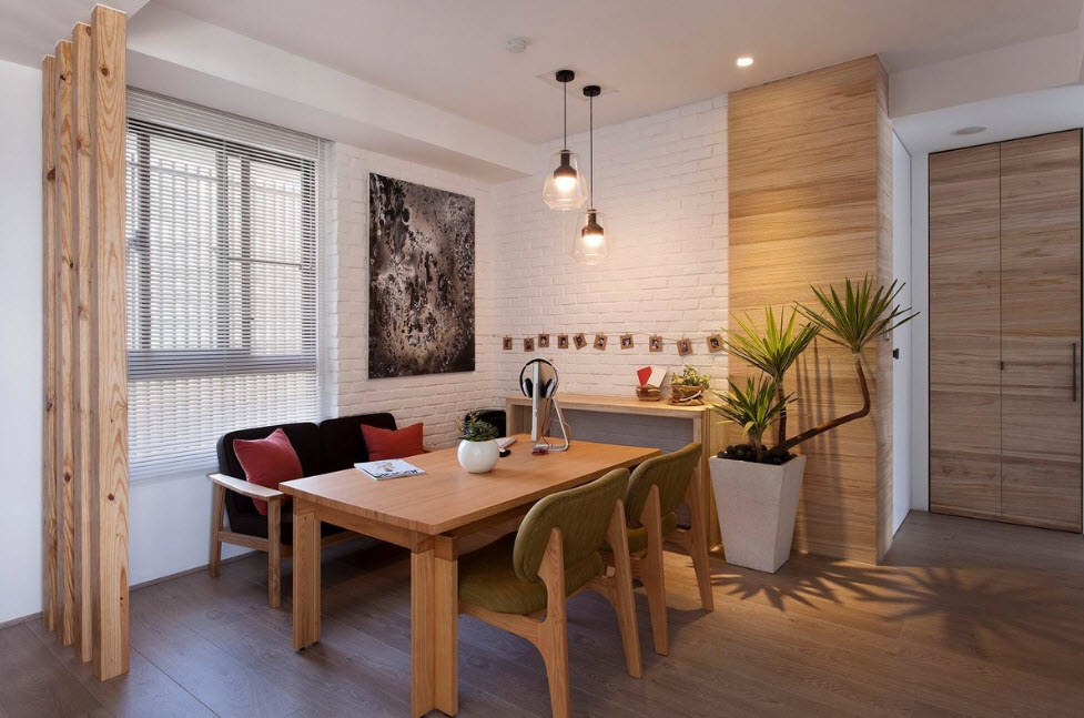 Если квадратура вашего помещения никаких положительных эмоций не вызывает, то такая отделка отлично впишется в ваш интерьер и даже сделает его заметно просторнее. Правда, вопросы по высоте помещения все равно останутся: к сожалению, горизонтальное оформление стен ламинатом здорово работает только на визуальное расширение пространства в ширину. Как же быть, если нельзя похвастаться и должной высотой потолков? Подсказываем вам замечательное решение — завершить отделку на один или два панельных ряда ниже уровня потолка. Это позволит обмануть наше зрение и хоть на немного, но все же поднять потолок вверх при беглом восприятии. Также можно вдоволь поэкспериментировать и самим размещением. Например, использовать смещения для более искусной имитации кирпичной кладки или доски. Или же и вовсе заручиться поддержкой хаоса и попытаться создать интерьерную эклектику — опытные дизайнеры часто используют этот прием, но далеко не каждому владельцу недвижимости он приходится по душе.