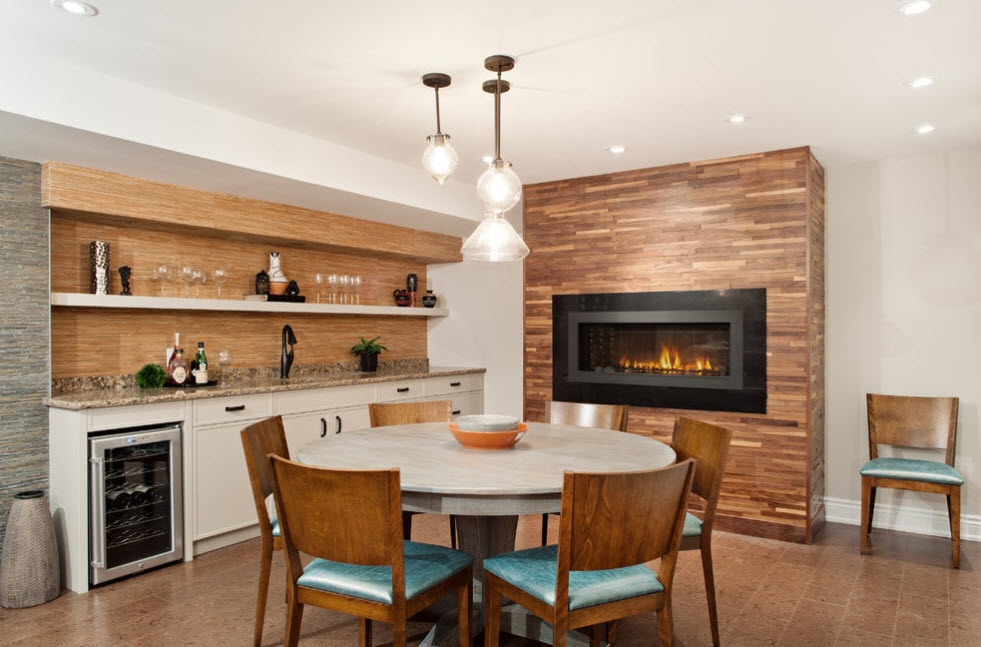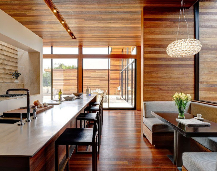 В том случае, когда ламинированная плита перетекает от стены к потолку, создается своеобразный шатер, замыкающий обеденную зону. Под ним прячут электропроводку, идущую к светильникам.