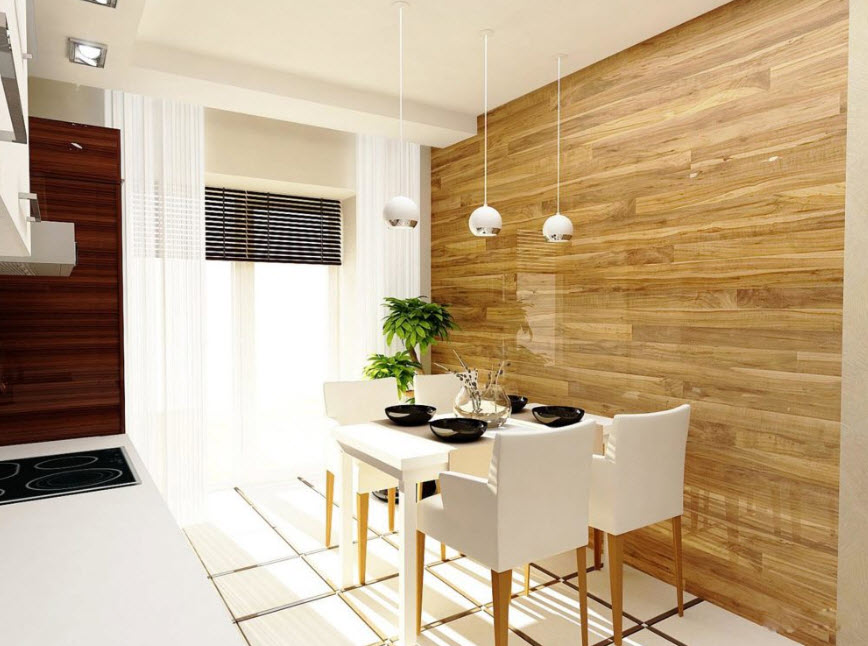 На фото показано, как участок стены с ламинатом на кухне оттеняет светлую обеденную группу.