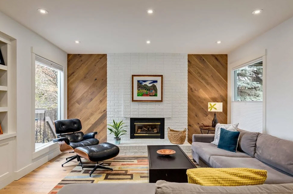 А вот и готовое решение для тех, кто решительно бросает вызов всем стереотипам при оформлении интерьера. Диагональная укладка позволяет подчеркнуть оригинальный вкус владельцев недвижимости и прекрасно интегрируется в любой современный стиль оформления. Мы подобрали для вас несколько фото с ламинатом на стене в тех интерьерах, где использование диагонального размещения панелей более чем оправдано.