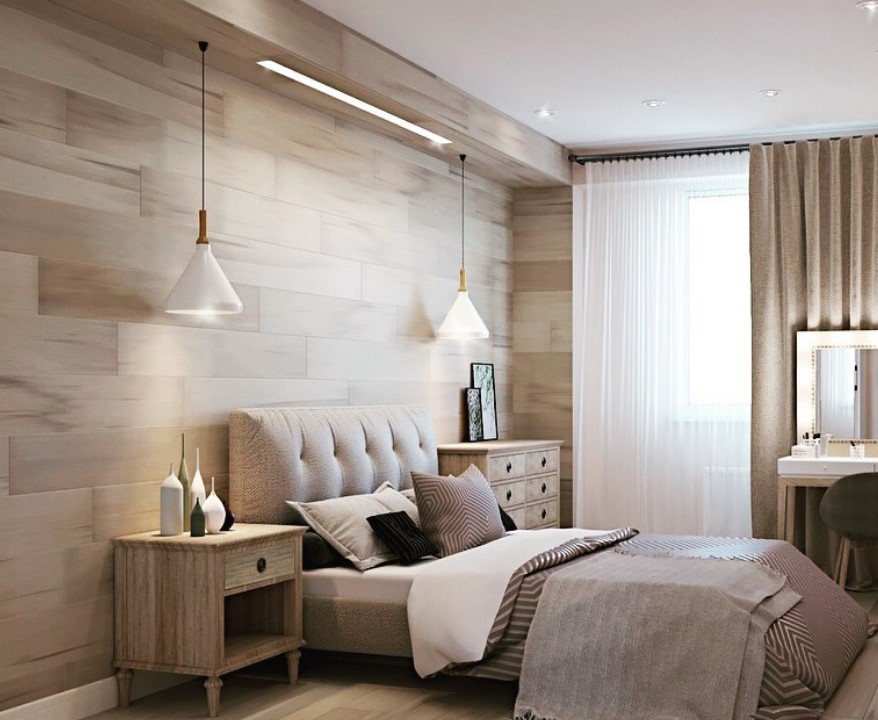 Оттенку облицовки здесь уделяется особое внимание, ведь спальня – это зона комфорта. Исключаются любые слишком яркие раздражители, в том числе и цветовые