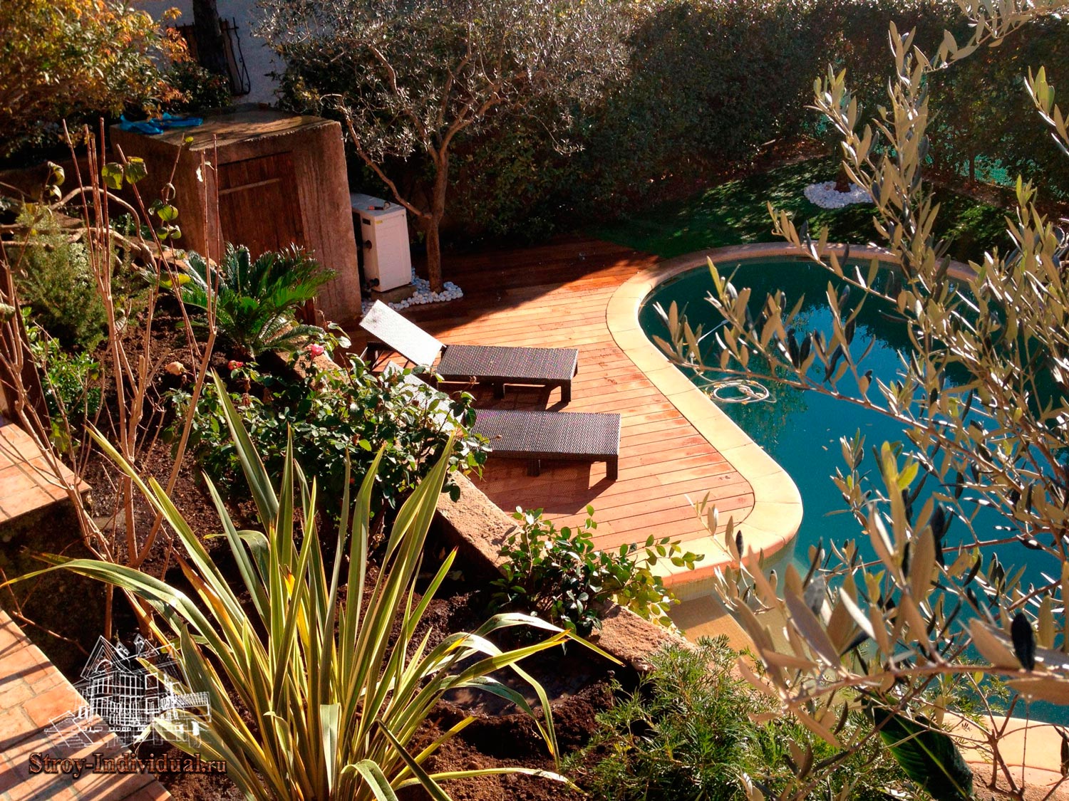 Возле бассейна легко обустроить так называемое «патио». Это место с мягкими диванами на основе английского стиля, креслами, столиком для кофе, чтобы организовать незабываемый завтрак, обед либо ужин для домочадцев либо гостей.