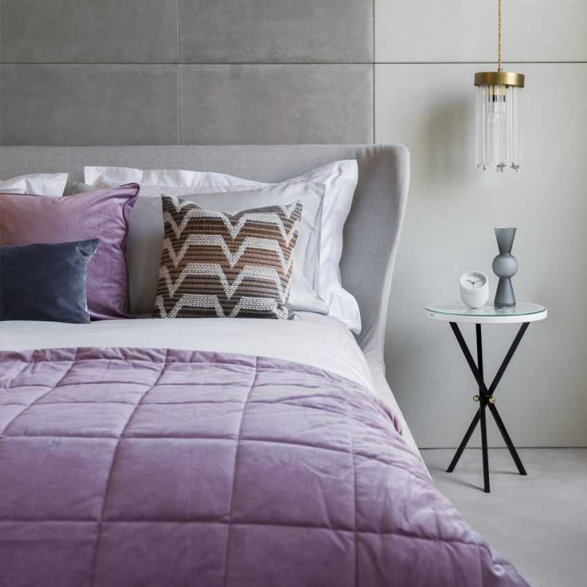 Приглушенный серый интерьер спальни с фиолетовыми акцентами