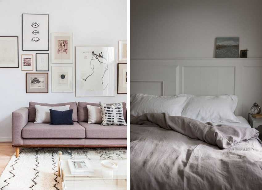 | Лавандово-серый | Комбинация особенно удачна в пастельных тонах. С преобладающим серым цветом интерьер будет казаться холоднее, с лавандовым ярче. Сочетание подходит для комнаты в стиле неоклассика, хай-тек, скандинавский. | |