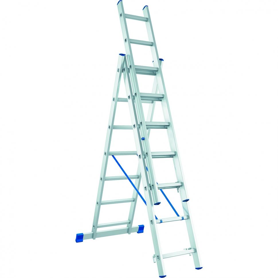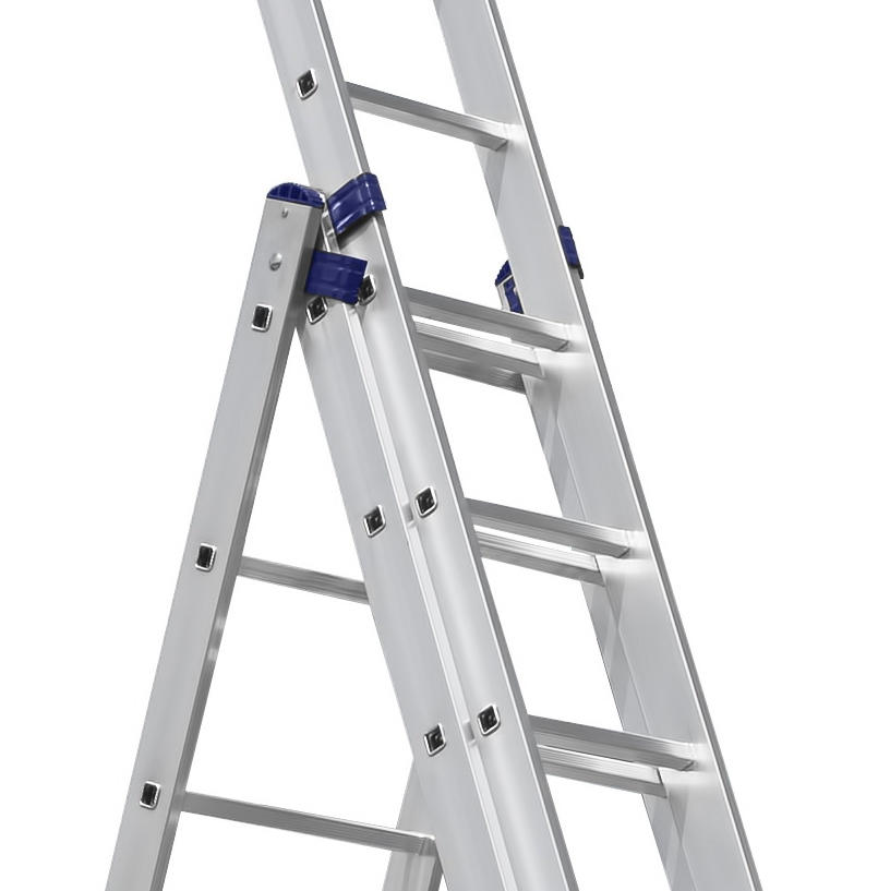 Трехсекционная лестница, имеющая со стороны основания расширенную площадку для большей устойчивости, в разобранном виде достигает длины в 4,55 м. Наличие ограничительных ремней предотвращает расхождение секций при использовании в качестве стремянки. Третий пролет может быть легко отделен от основной конструкции и использоваться как небольшая приставная лестница высотой 170 см. Такая универсальность и оптимальная высота сделали эту модель одной из самых востребованных на рынке. Алюминиевый широкий профиль обеспечивает высокую прочность (расчетный вес нагрузки составляет 150 кг), но и при этом весит всего 8,8 кг. Она удобна как для дома, так и для использования профессиональной деятельности.