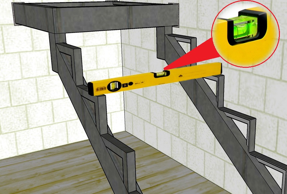 Также рекомендую еще один способ контроля установки косоуров. С помощью строительного уровня, в нашем случае длина инструмента должна быть не менее 800 мм, определяем горизонтальность опорных сторон косоура для установки ступеней.