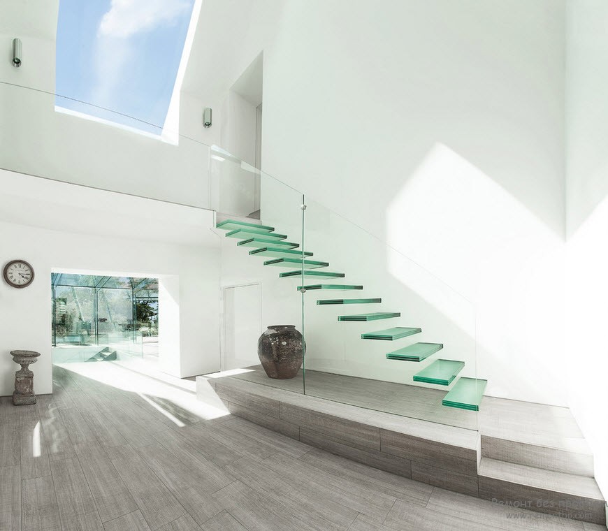 Чтобы небольшое помещение выглядело просторным, ступени, ведущие на второй этаж, можно изготовить из специально закаленного стекла. Такой ход позволит придать лестнице невесомости.