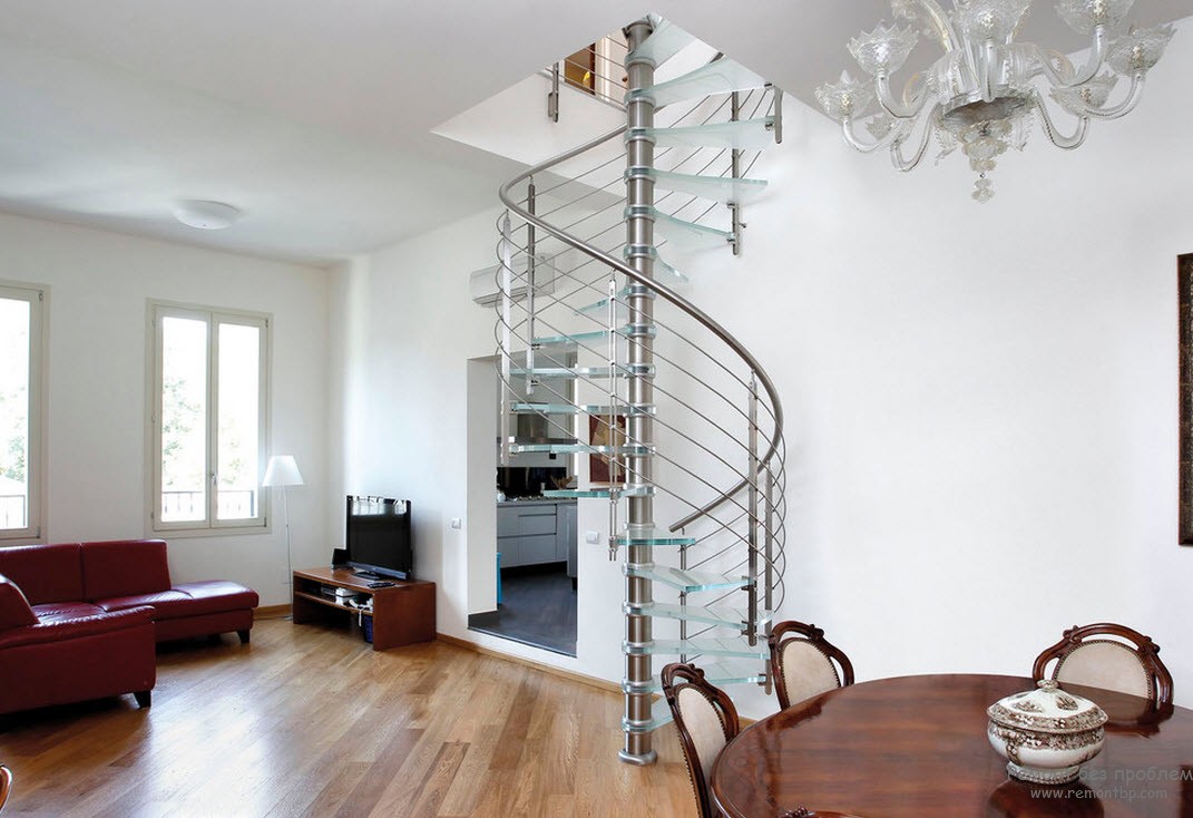 Для помещений небольшой площади рекомендовано использование винтовой конструкции или сооружения, имеющего забежной тип. Это наиболее компактные варианты. Они выглядят красиво и изящно, они компактны, но не слишком подходит для частого использования.