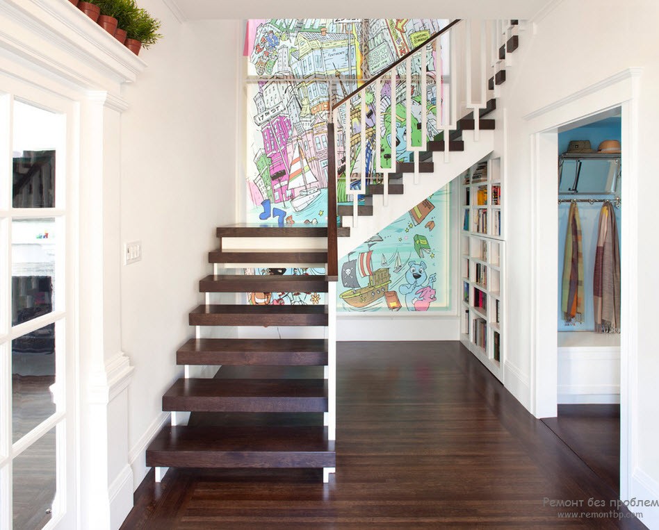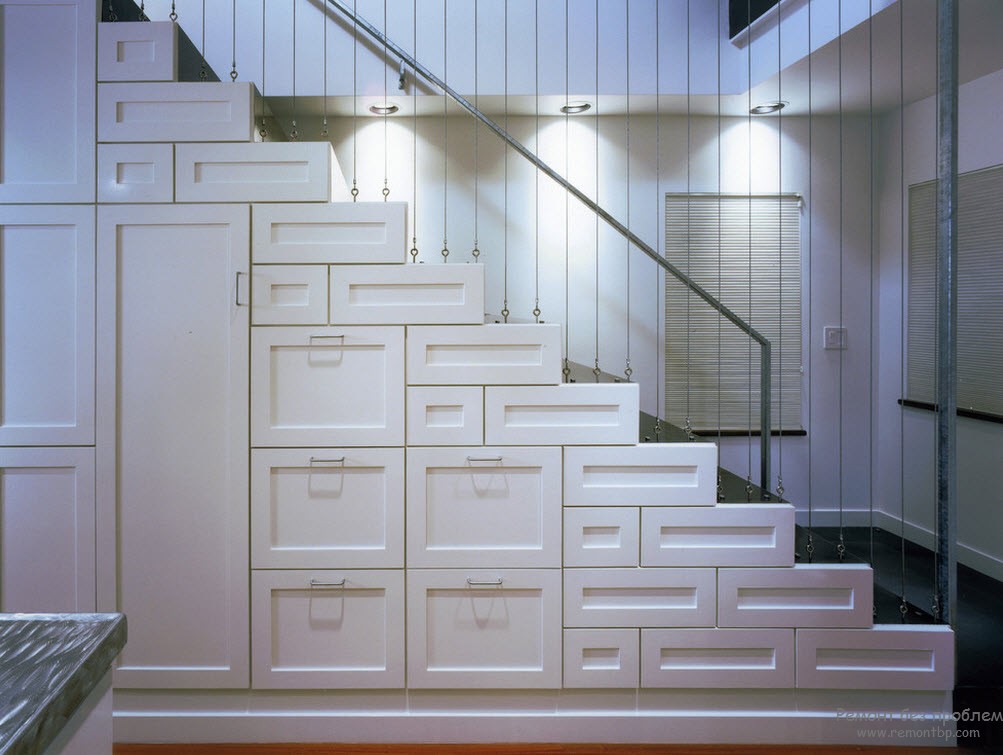 - местонахождения в доме. Так, если лестница находится на входе прихожей, то имеет смысл сделать под ней гардероб. На кухне можно сделать выдвижные ящики, в гостиной – диван или библиотеку;