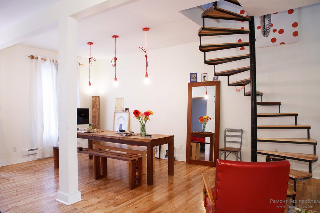 Она мгновенно притягивает к себе взоры, т.к. несет эффект неожиданности, оживляя интерьер своим присутствием. Однако, вариант изящной винтовой лестницы совершенно не подойдет пожилому хозяину дома или человеку, чьи физические возможности весьма ограничены. К тому же, по ней может перемещаться не более одного человека.