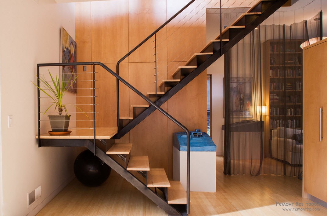 Если сооружение располагается на территории гостиной или прихожей, обладающей достаточной площадью, то рекомендована минимальная высота ступеней и удобная ширина марша. Такой тип должен иметь перила и поворотную площадку. Это наиболее безопасный вариант.