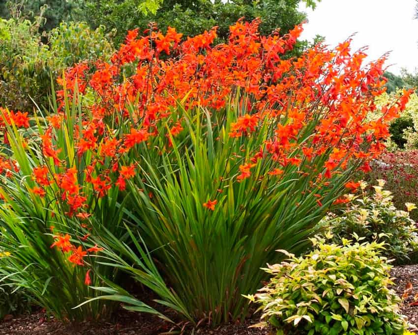 Каждый цветок имеет форму пятиконечной звезды, лепестки могут быть загнуты назад. В зависимости от сорта их диаметр варьируется от 2 до 5 см, бутоны обычно окрашены в красный, желтый или оранжевый оттенок. Крокосмия лучше всего смотрится в составе групповой посадки или в миксбордере на заднем плане