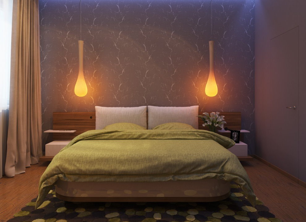 Осветительный прибор подбирается с учетом размера кровати, чем больше спальное место, тем массивнее должен быть потолочный светильник. Габаритную кровать можно также с двух сторон оформить симметричными подвесными лампами. Однако такое размещение подходит не для всех спален так, как из-за смещения центра пространство зрительно становится меньше.