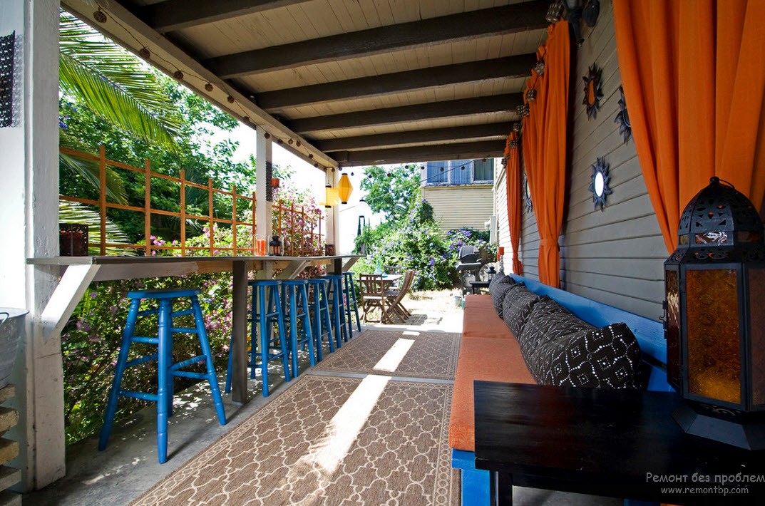 Отделка стен и арок может осуществляться с помощью марокканской плитки. Чайный столик также незаменим. Цветовая палитра отличается отинтерьерной.