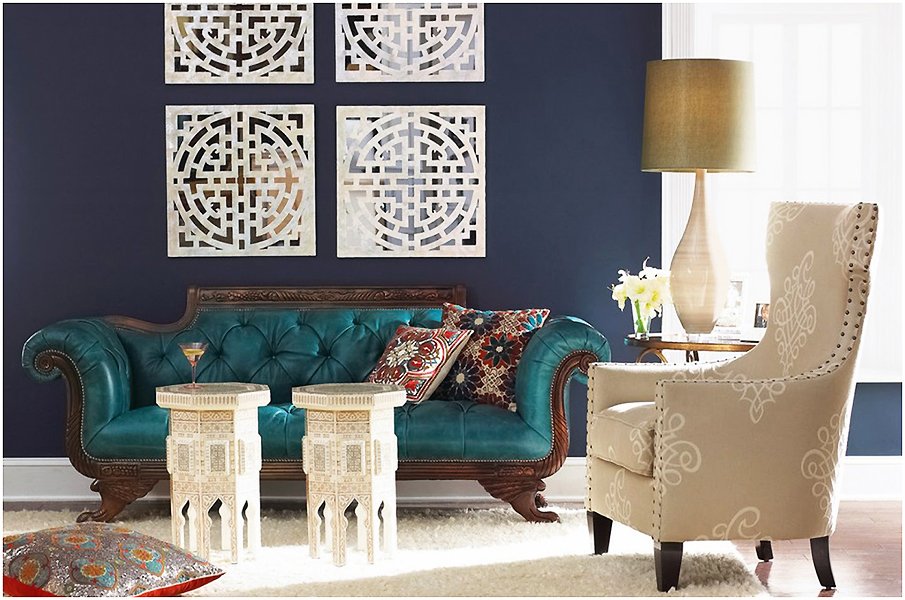 Пальма первенства принадлежит декоративному текстилю. Интерьер украшают декоративными подушками, домоткаными коврами, шторами с восточными узорами. В качестве аксессуаров используют большие зеркала в стилизованных рамах, композиции из свечей, медные кувшины и тарелки, украшенные чеканкой.