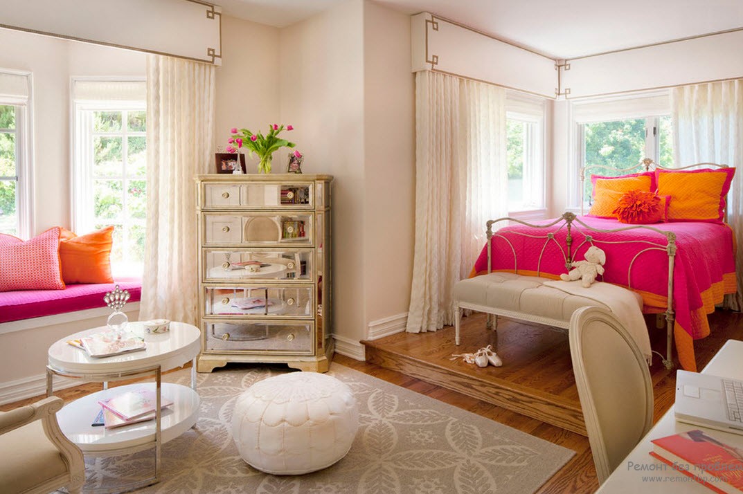 Наличие пуфов и соф не возбраняется. Все то, что может сделать пребывание в комнате еще более комфортным и безмятежным только подчеркнет насыщенность стиля.