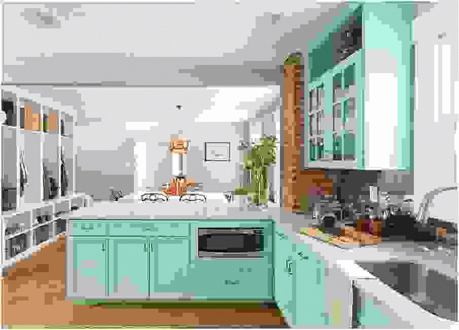 Мятный вообще очень хорош для кухни, так как это цвет свежей зелени, лайма, яблока. В кухне и столовой этот оттенок наиболее «сочно» раскрывается в сочетании с фруктово-ягодными тонами желтого, оранжевого, розового цвета.