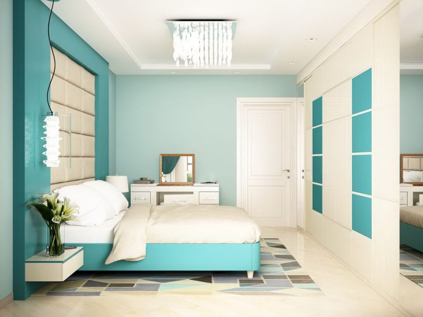По внешнему виду становится понятно, что домашняя комната, оформленная в светло-бирюзовом оттенке, создает легкую прохладу, подчеркивает уют и добавляет строгости.