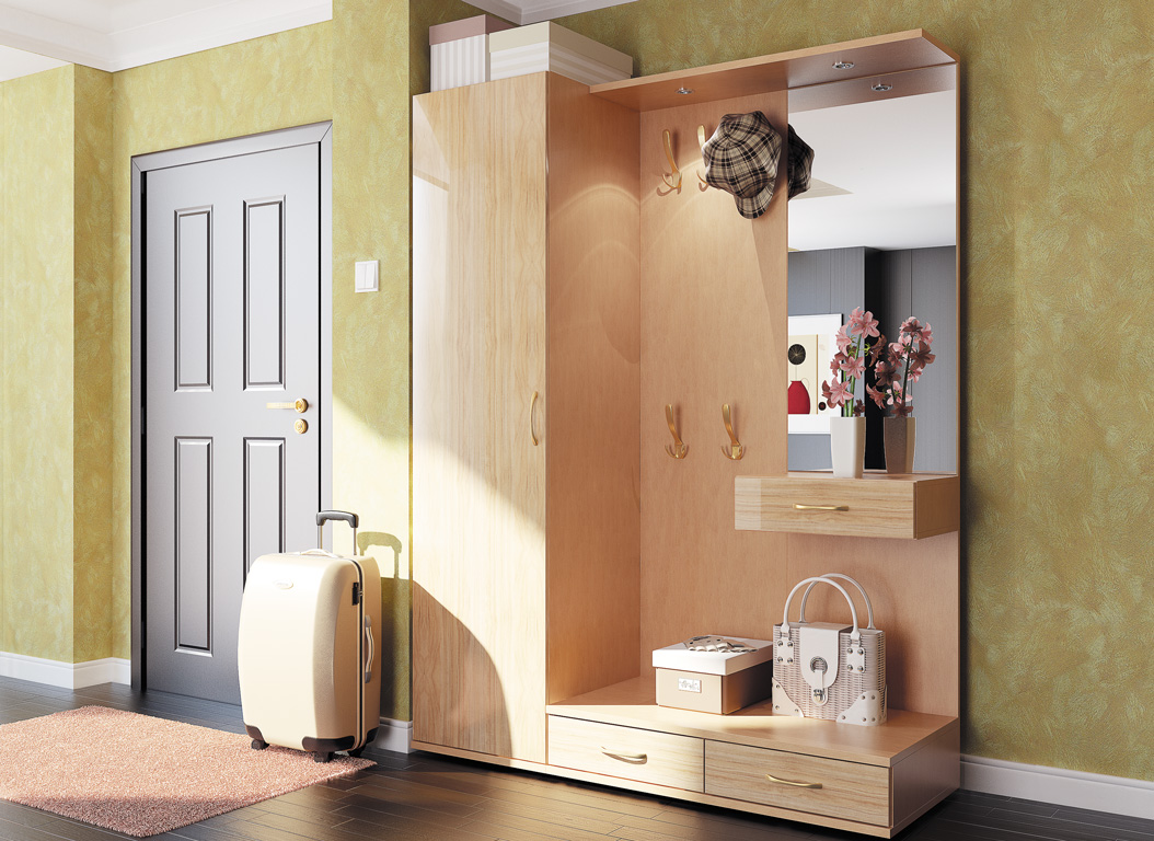 Бывает, что и этот скромный набор не вмещается, и тогда приходится обходиться вообще вешалкой или набором крючков, небольшой полочкой и зеркалом