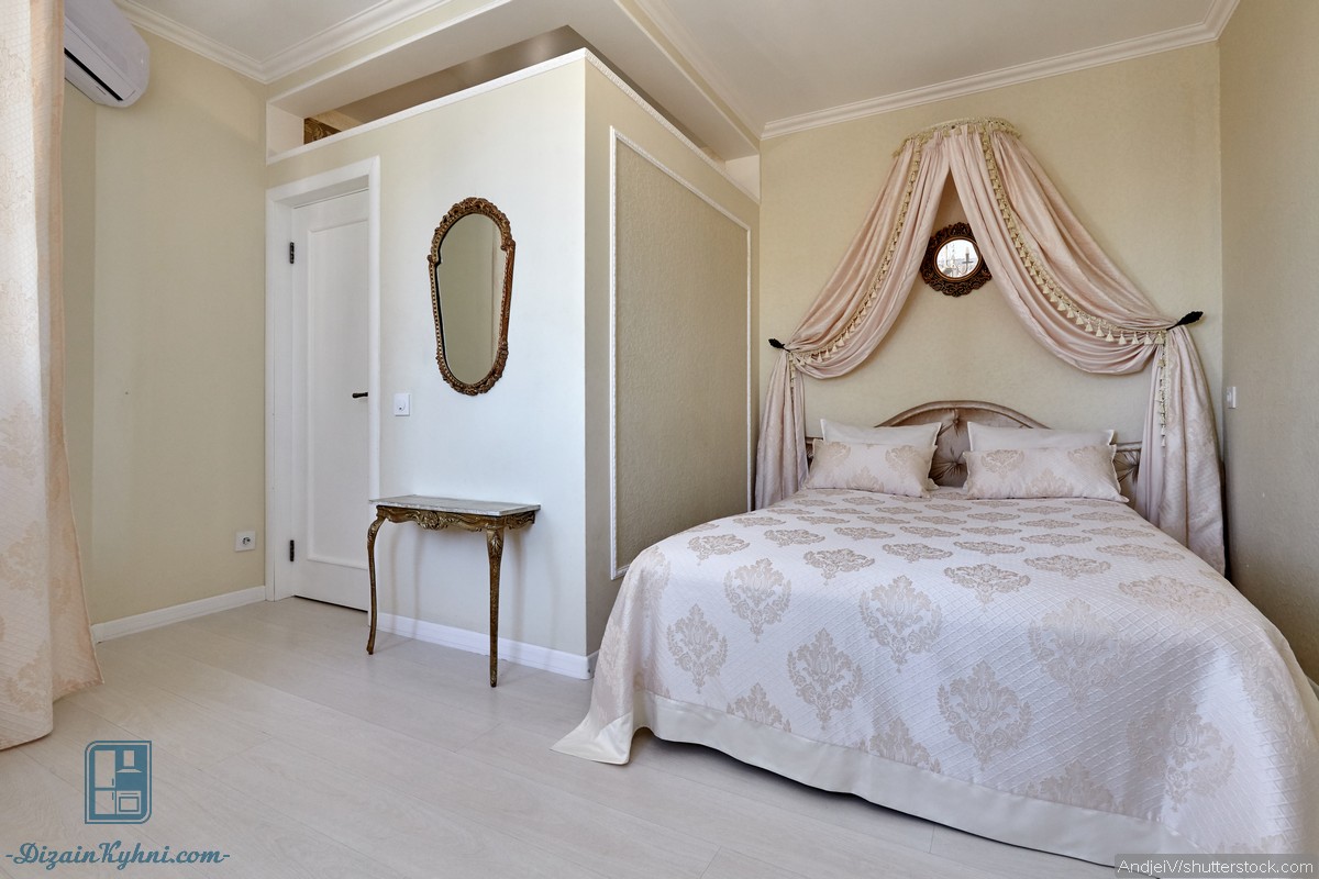 Для оформления кровати в классическом стиле часто используется балдахин или тканевый занавес.