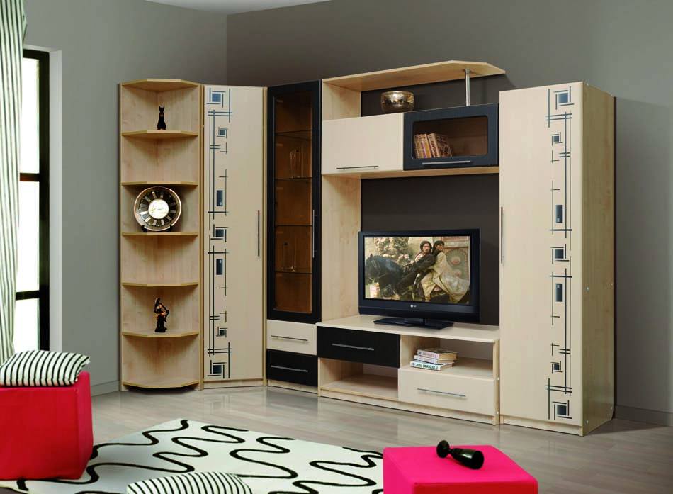Можно купить набор из двух шкафов и тумбы. На тумбочку устанавливают телевизор и помещают ее в центре композиции. Шкафы устанавливают по углам стены. В зависимости от варианта исполнения в них можно хранить книги, посуду или диски с фильмами.