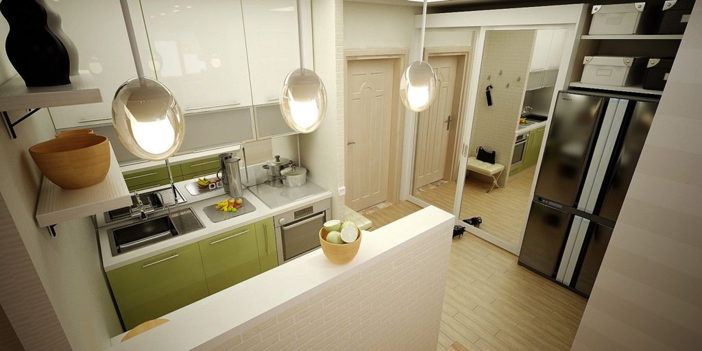 Простое и практичное решение, предусматривающее снос перегородки между кухней и коридором. Как вариант, в образовавшемся проеме можно оборудовать арку. Помещение кухни делим на две неравные части. На меньшей оборудуем кухню-нишу, устанавливая стандартные шкафы вдоль трех стен, оставляя минимальное место для прохода.