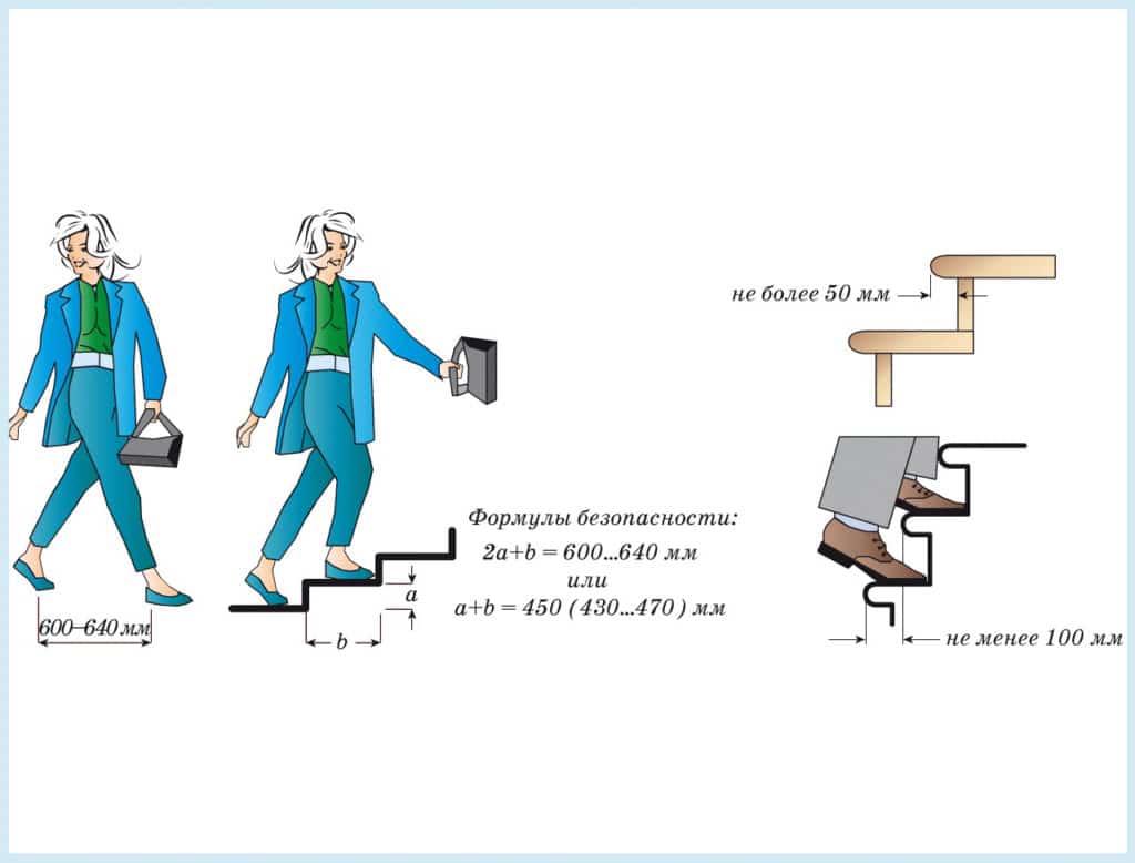 Для определения более точного значения можно воспользоваться определенной формулой. Нужно взять среднюю ширину человеческого шага (600 – 640 мм) и вычесть из нее высоту подступенка, умноженную на 2, т.е. 640 – 2х175 = 290 мм. Этот показатель будет оптимальным для перемещения.