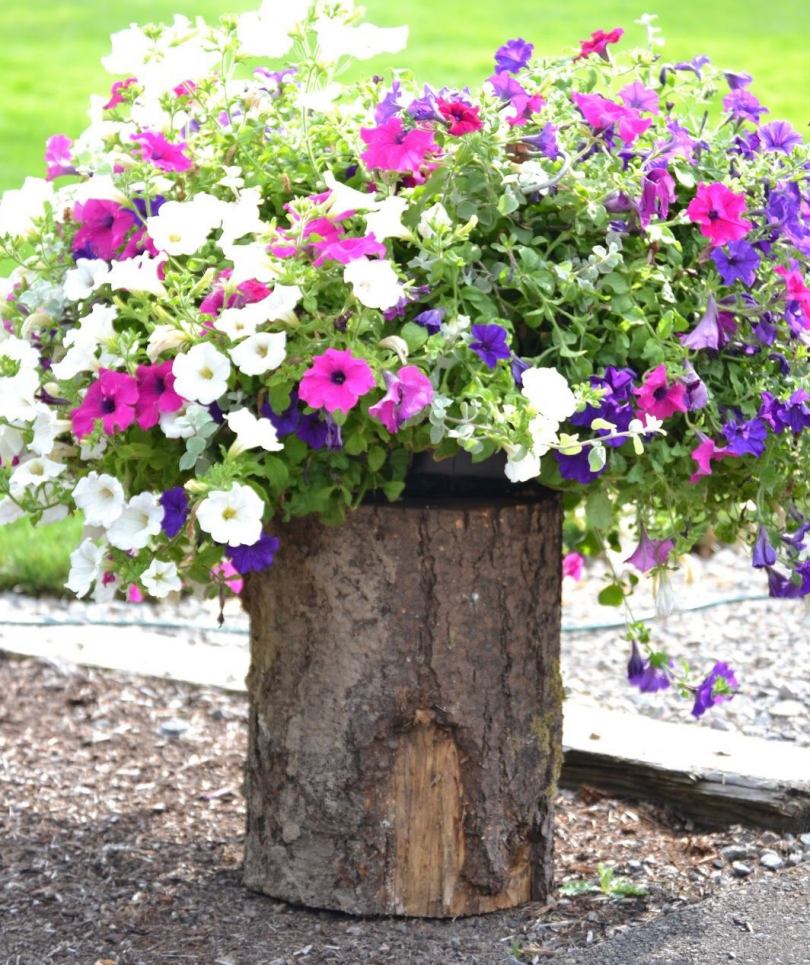 Высокая клумба с ампельными петуниями, размещенными в контейнерах на деревянном каркасе
