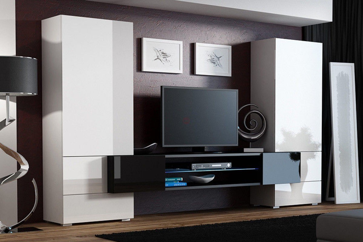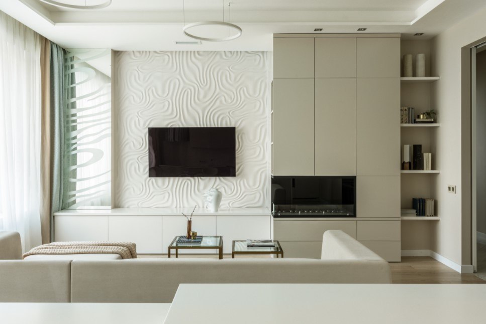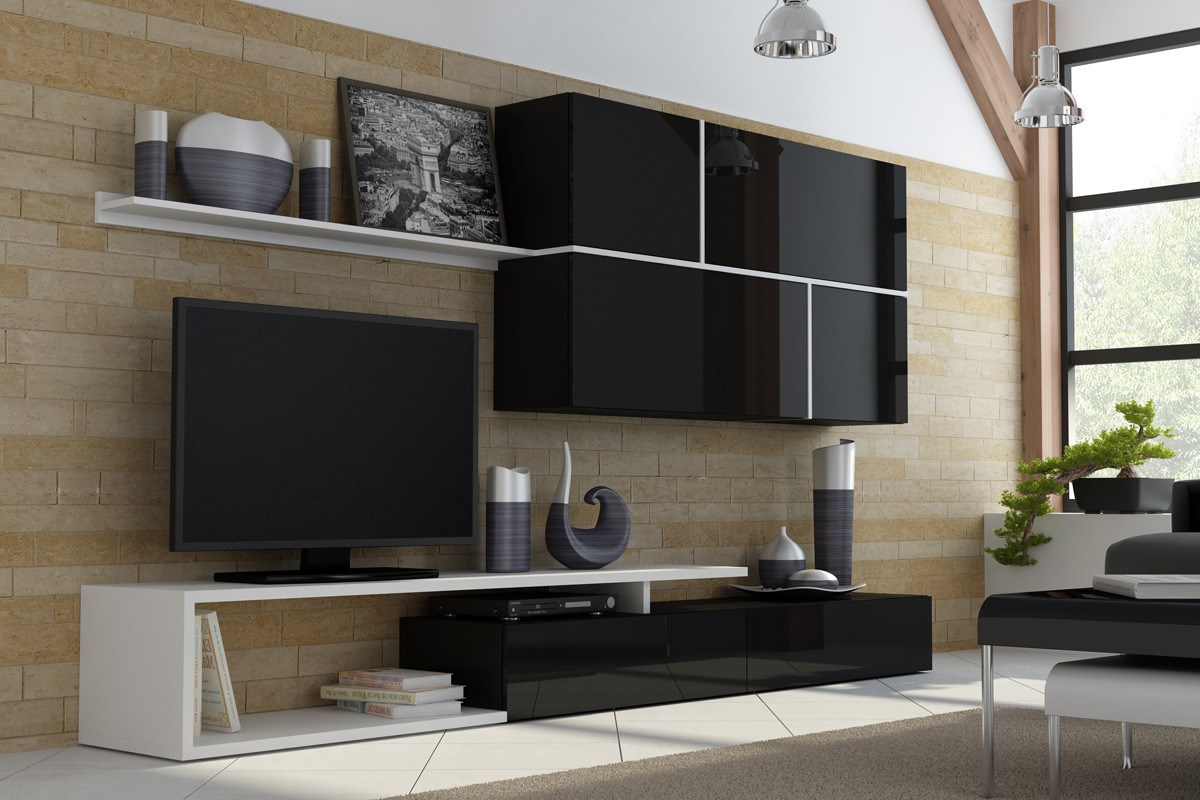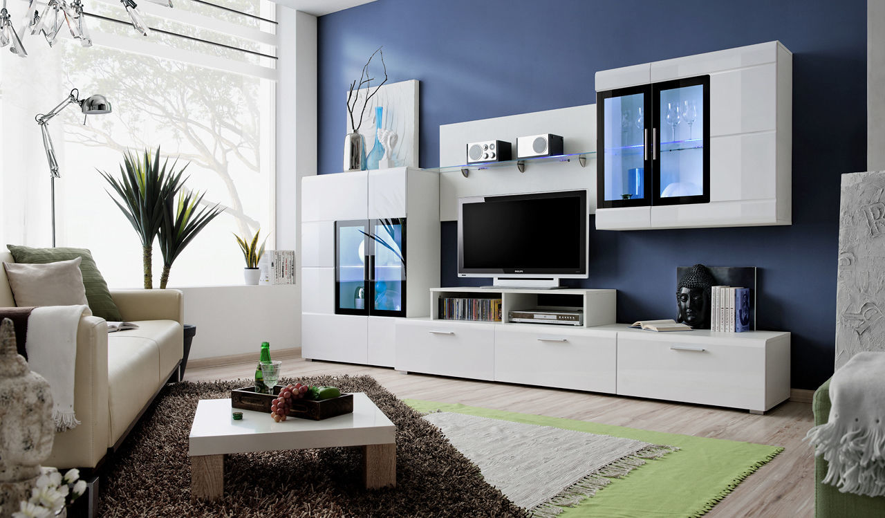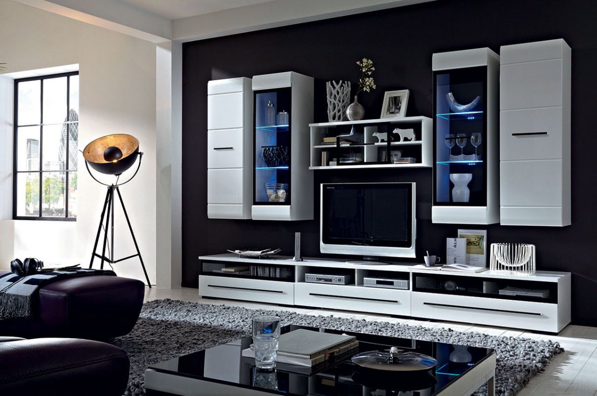 Идеальным решением для обустройства гостиной в стиле минимализм станут компактные модульные системы, отличающиеся простотой и лаконичностью. Конструкции с чёткими линиями и прямыми углами в этом случае подходят просто идеально. Минимализм – это однотонные гладкие фасады с минимальным декором либо его полным отсутствием, а также приглушенные оттенки, небольшое количество полок и дверей.