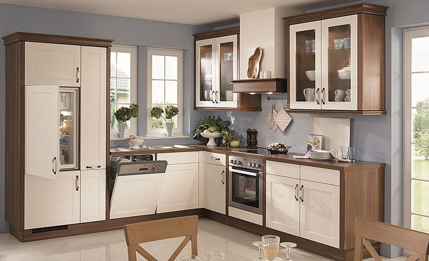 Использование данного цвета в столовой очень актуально. Просторная уютная кухня в теплых тонах предрасполагает к приятной беседе за семейным ужином. Цвет мебели «яблоня локарно» идеально подходит для этих целей. Также стоит отметить, что он не маркий, поэтому хозяйке не придется тщательно следить за состоянием поверхности. Его использование в небольших кухнях в сочетании со светлыми стенами этого же оттенка будет верным решением, таким образом не создается эффект загроможденного давящего пространства.
