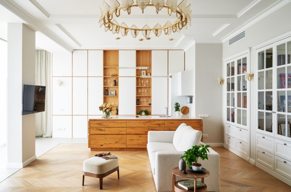 Главной особенностью этого стилевого решения является качество, функциональность и удобство. Поэтому наиболее удачным решением станут лаконичные модульные системы из натурального дерева, с минимальным количеством декора, в светлых тонах, что позволит визуально расширить пространство и придаст помещению ощущение лёгкости и воздушности.