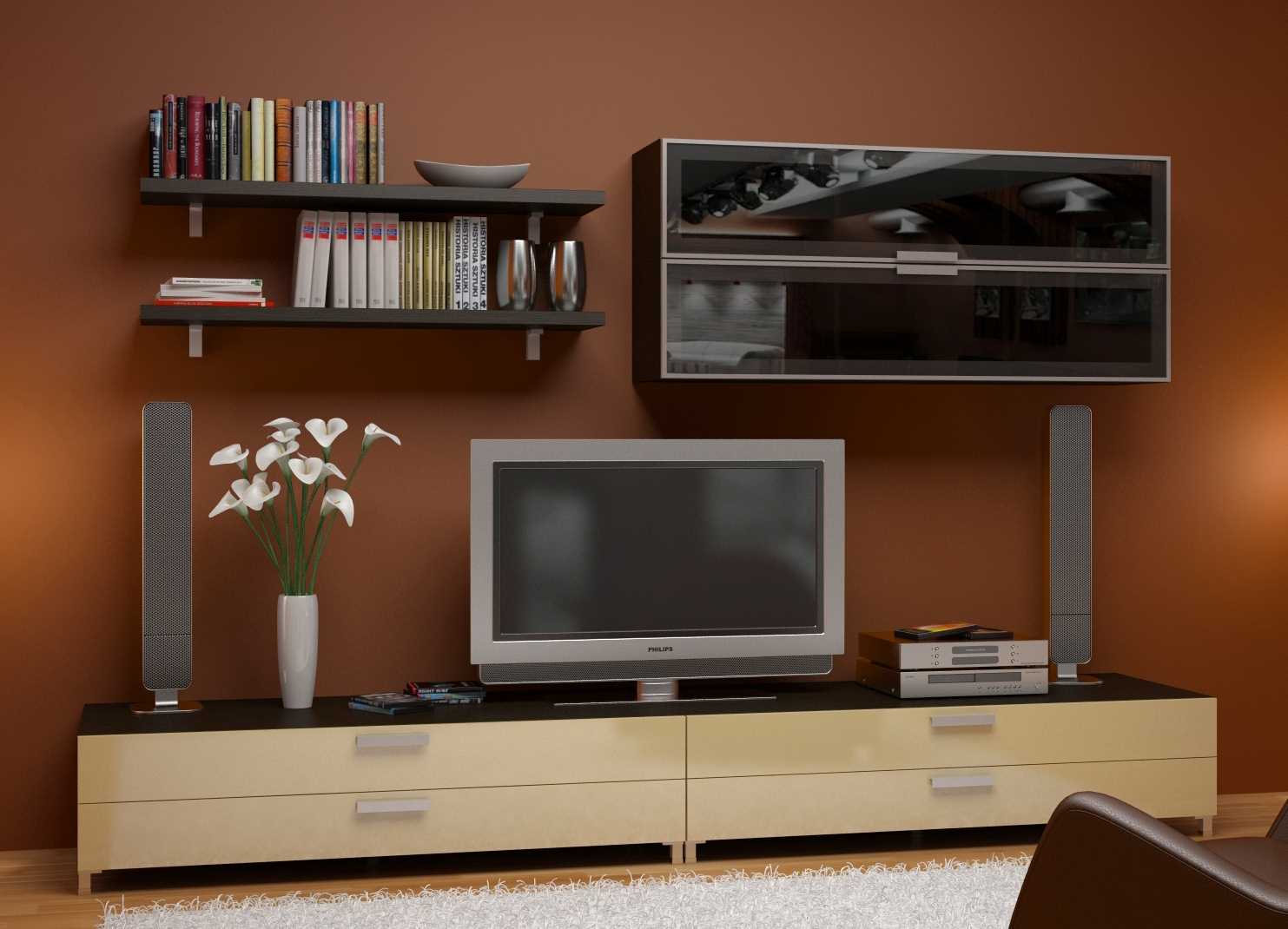 - напротив дивана надо поставить стеллажи и невысокие тумбы под теле или радиоаппаратуру. Комната не будет чрезмерно заставленной;